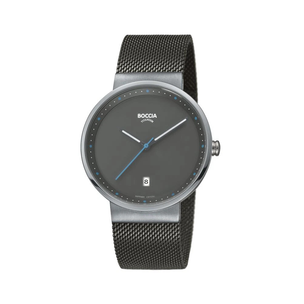 Herrenuhr vom Titanspezialisten BOCCIA - edel mattiertes Reintitangehäuse, dunkelgraues Edelstahl-Milanaisearmband, kratzbeständiges Saphirglas, 5 ATM wasserdicht