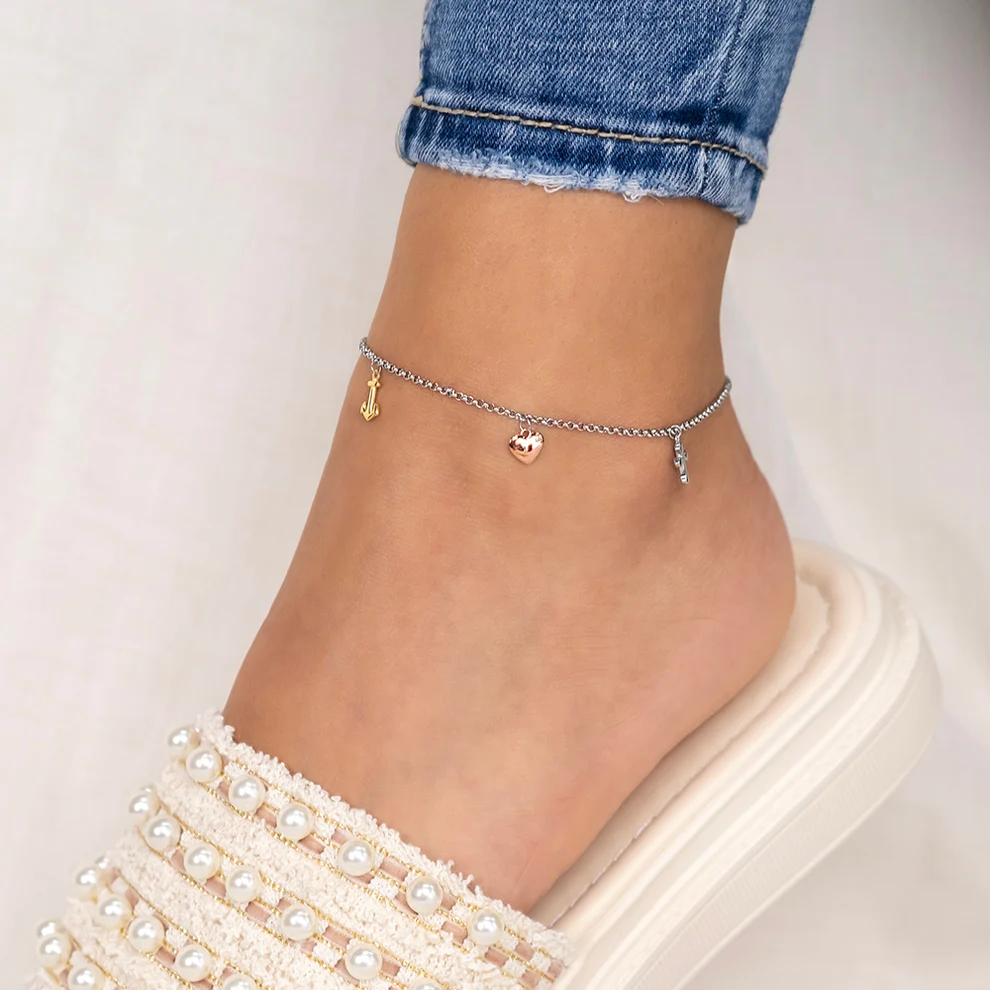 Drei Symbole zum Verlieben – dieses zauberhafte Fußkettchen mit unseren Tricolor Anhängern Kreuz, Herz und Anker vereinen sich zu einer kraftvollen Erscheinung. Motive für Glaube, Liebe & Hoffnung begleiten Dich Tag für Tag mit starker Symbolik. Das ausdrucksstarke Tricolor besticht in zart schimmernden Pastelltönen und wirkt besonders sanft. Kombiniert mit mehreren Fußkettchen entsteht ein toller Layering-Effekt, der als Duo, Trio oder Quartett eine wunderschöne Symphonie ergibt. Das Kettchen kann individuell zwischen 22 cm und 27 cm Umfang eingestellt und mit einem Karabinerhaken verschlossen werden.