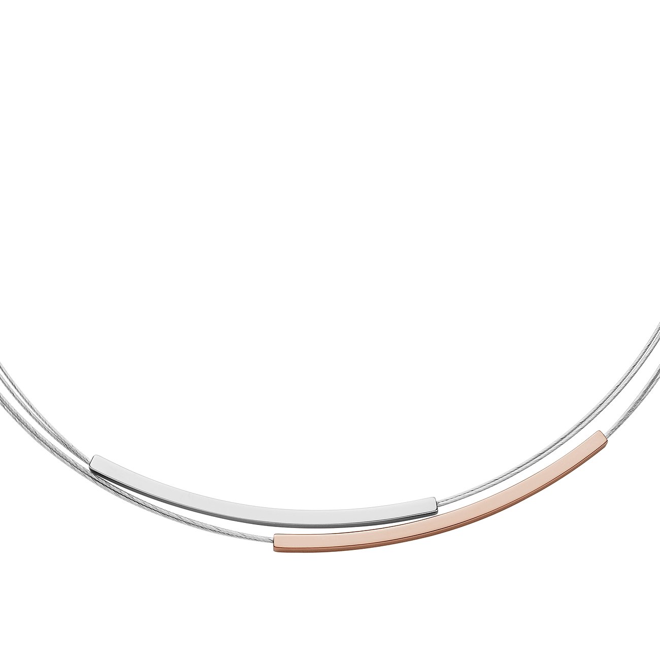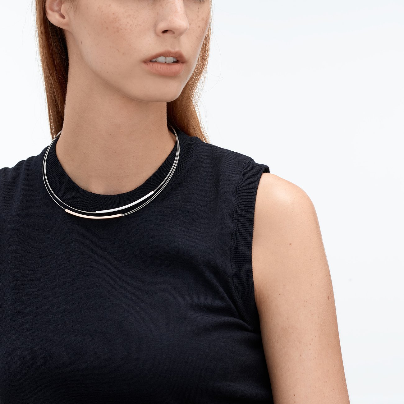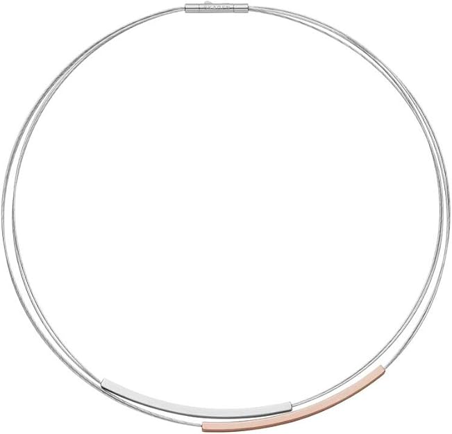 Diese kurze Halskette besteht aus vier filigranen Drahtseilen mit silber- und roségoldfarbenen Stäben. Sie wird von einem Steckverschluss gehalten.