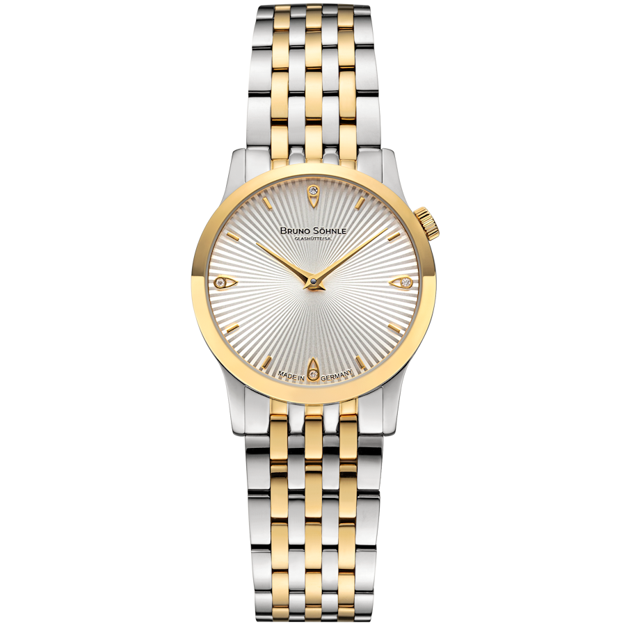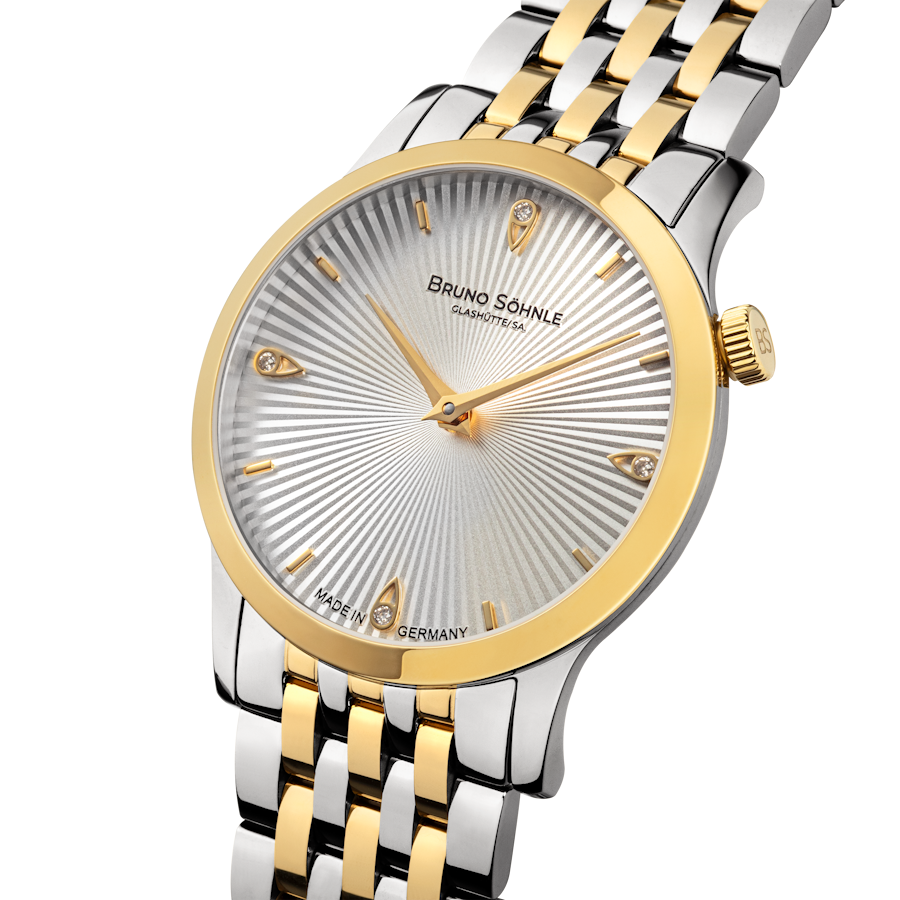 Quarzwerk in veredelter Bruno Söhnle-Ausführung (Basiswerk Ronda 1062), Edelstahl Bicolor IP Gold, Ø 28,5 mm, Höhe 6,0 mm, 3 bar, Saphirglas innen entspiegelt, massives Edelstahlarmband Bicolor IP Gold, massive Butterflyfaltschließe, 4 Brillanten
