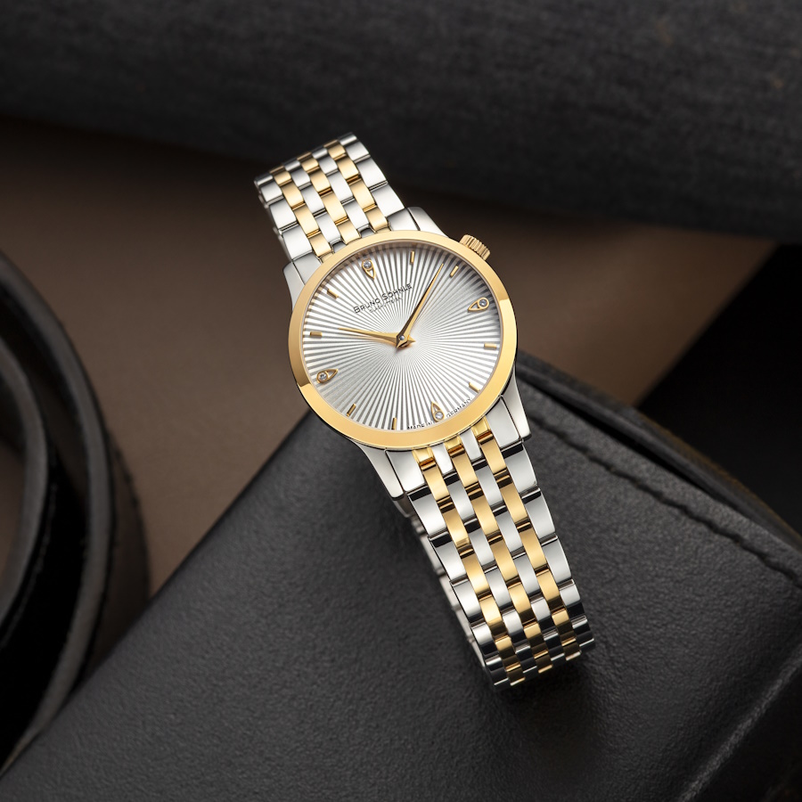 Die Bologna IV in der bicolor-Version kombiniert Edelstahl mit partieller IP-Gold-Beschichtung, was ihr ein modernes und elegantes Aussehen verleiht. Mit einem Gehäusedurchmesser von 28,5 mm und einem silbernen Zifferblatt, das durch einen Wellenschliff und vier brillante Tropfen-Indizes verziert ist, bietet diese Uhr sowohl Stil als auch Funktionalität. Die Krone auf der 2-Uhr-Position bleibt ein hervorstechendes Designelement. Das Edelstahlband sorgt für Tragekomfort, während das Ronda 1062 Uhrwerk, veredelt in Glashütte, präzise Zeitmessung gewährleistet.
