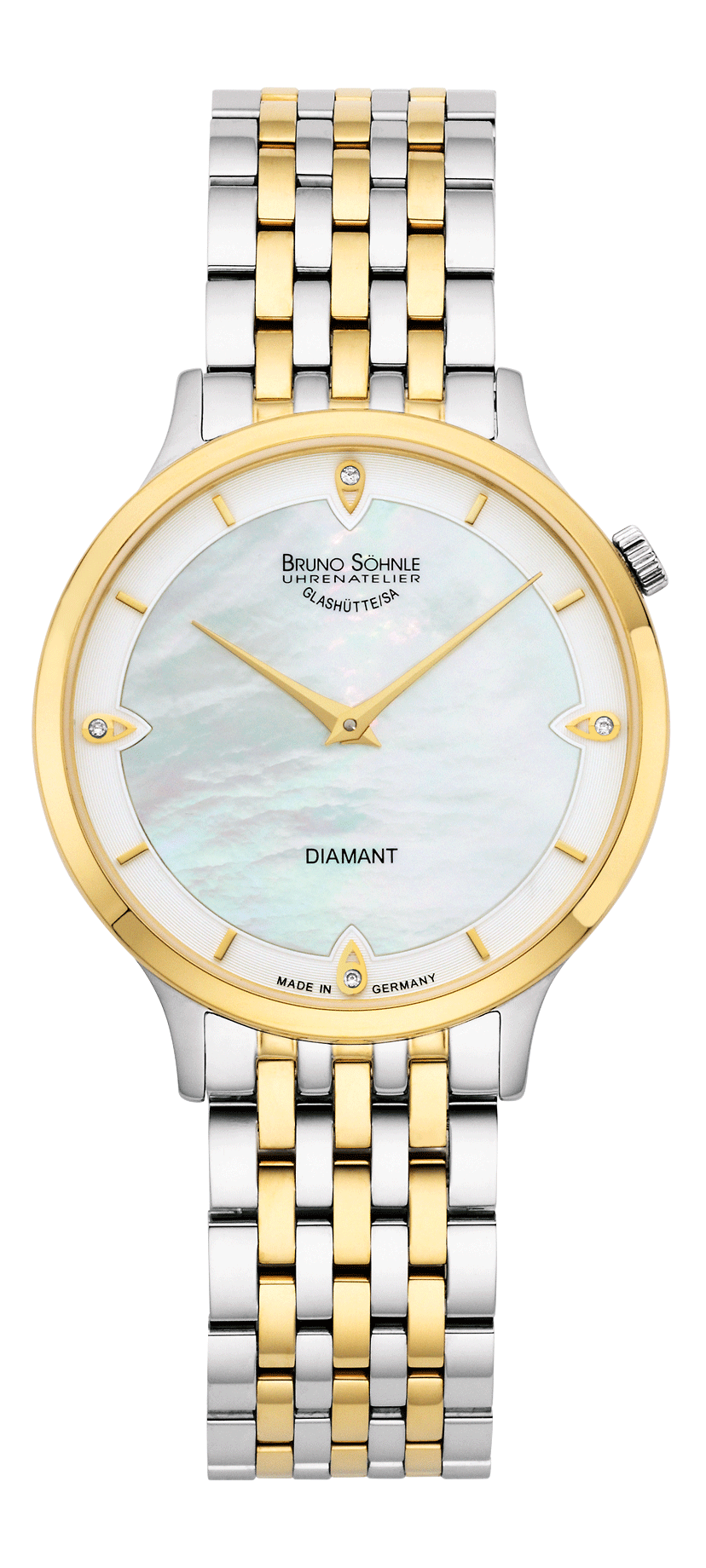 Quarzwerk in veredelter Bruno Söhnle-Ausführung (Basiswerk Ronda 1062), Edelstahl, Ø 35,0 mm, Höhe 6,0 mm, 3 bar, Saphirglas innen entspiegelt, Edelstahl, Faltschließe, 4 Brillanten
