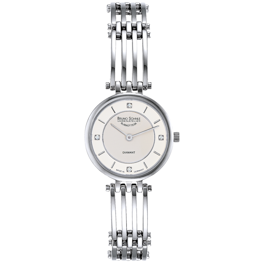 Quarzwerk in veredelter Bruno Söhnle-Ausführung (Basiswerk Ronda 1062), Edelstahl, Ø 25,0 mm, Höhe 6,0 mm, 3 bar, Saphirglas innen entspiegelt, Edelstahl, Faltschließe, 4 Brillanten