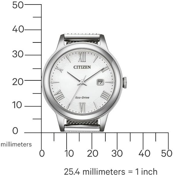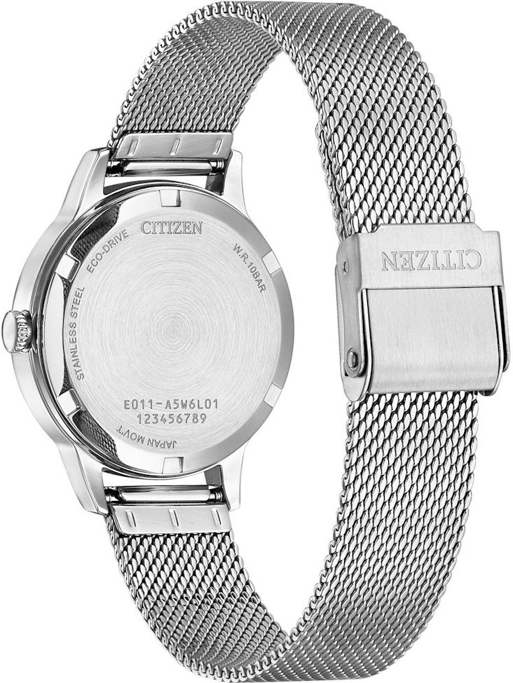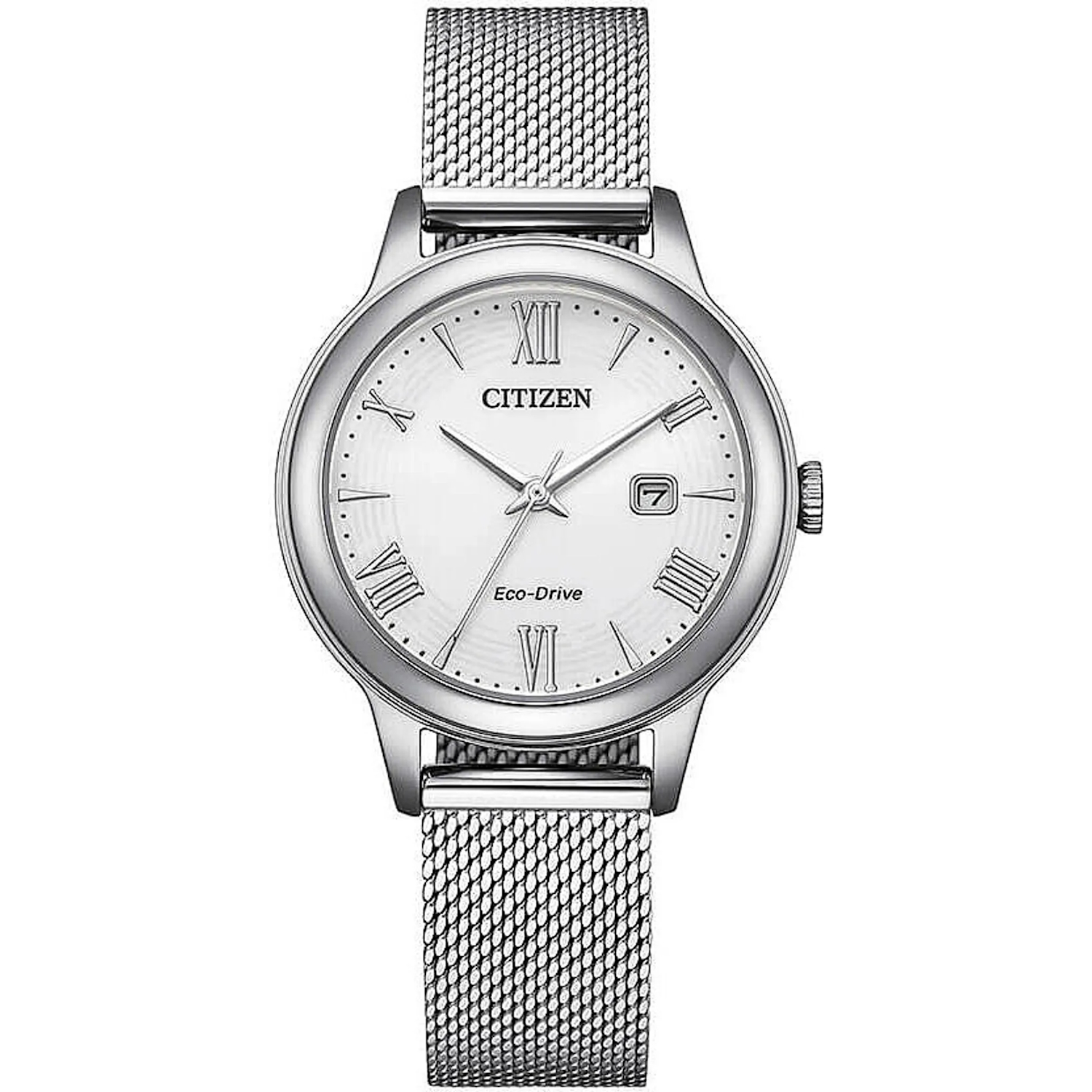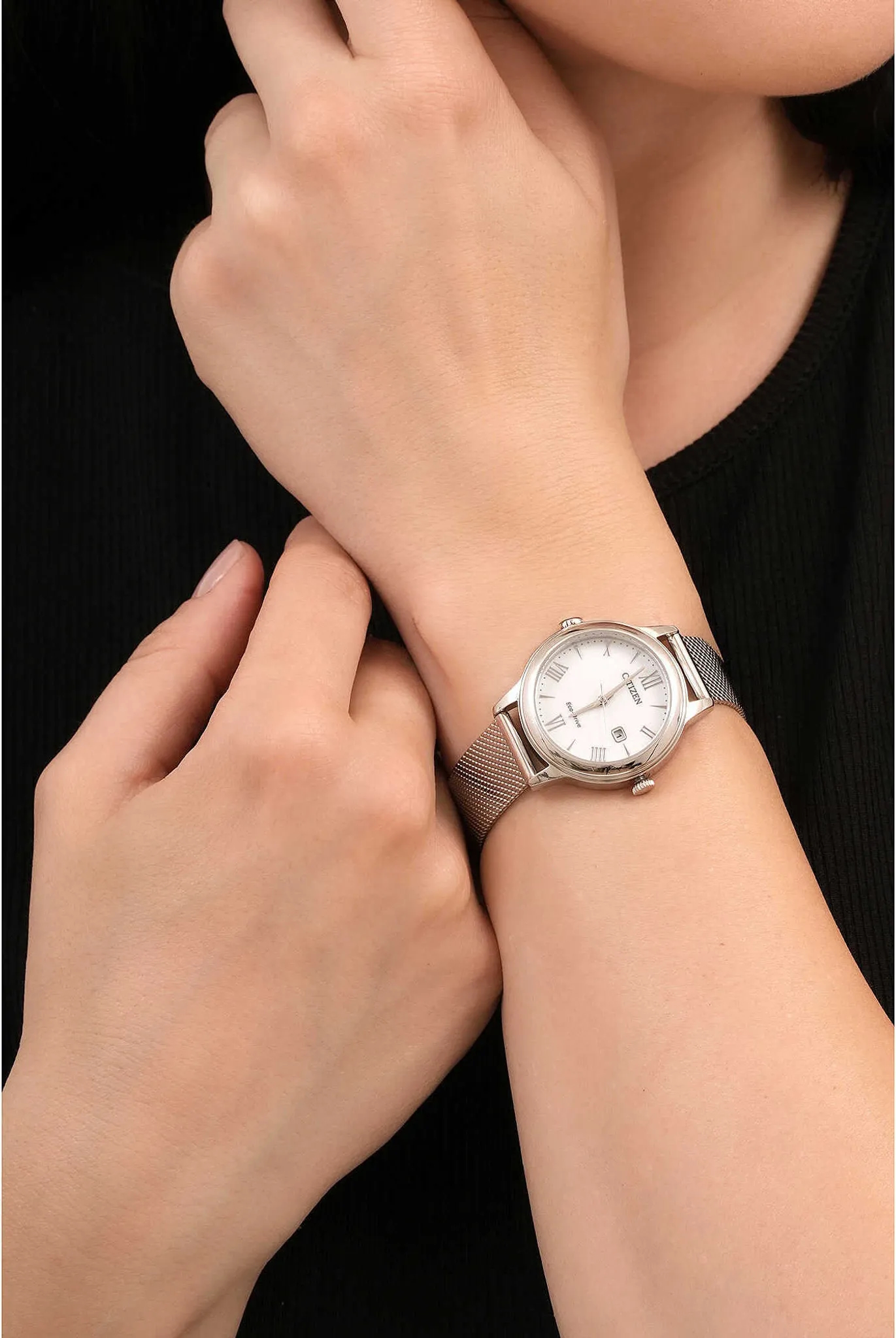 Damenuhr der Marke Citizen aus der Lady Dazzling-Kollektion. Eco-Drive-Time-Only-Uhr mit Stahlgehäuse mit 31 mm Durchmesser und Mineralglas. Weißes Zifferblatt mit römischen Ziffern und Milanaise-Stahlarmband. Eco-Drive-Uhrwerk mit Vorhängeschlossantrieb und 6 Monaten Gangreserve, Wasserdichtigkeit: 10 ATM. Datumsanzeige: ja. Die Referenz ist EW2621-75A