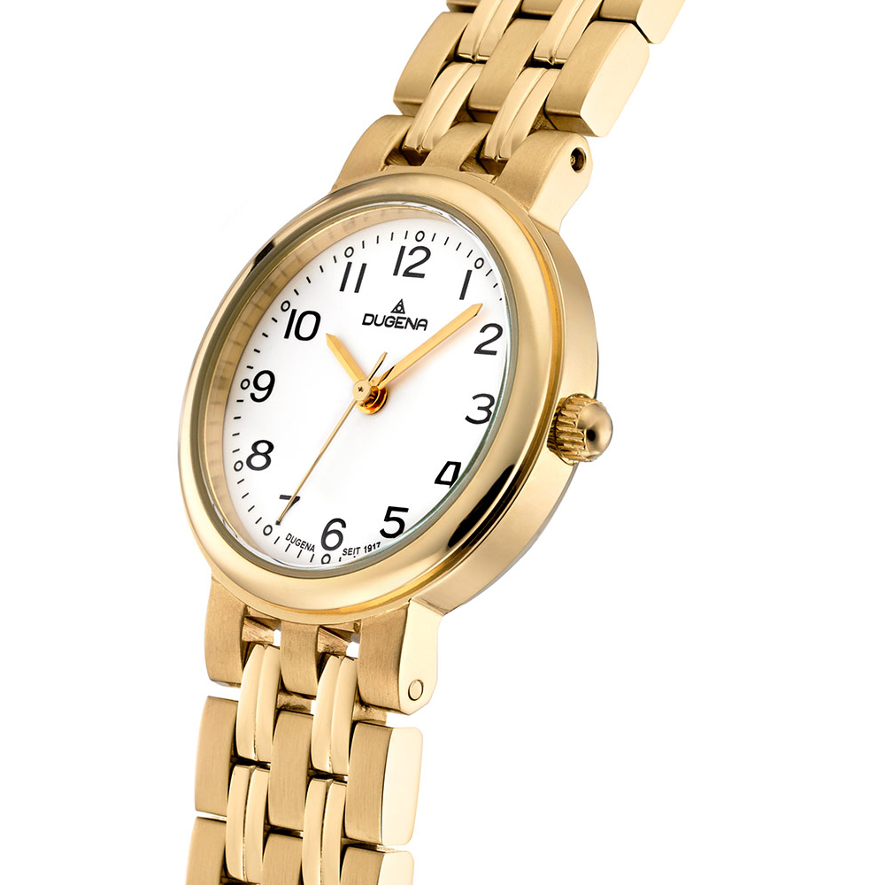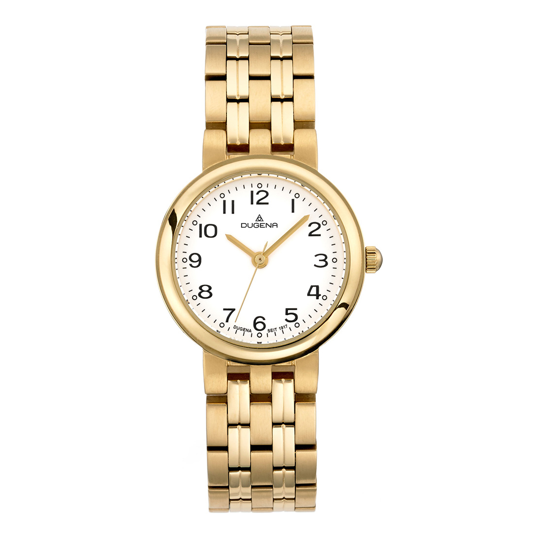Eine große Unternehmensgeschichte, unaufdringliche Eleganz, ein technisch ausgefeiltes Innenleben – das alles charakterisiert DUGENA-Armbanduhren zu echten Besonderheiten, die Ihr Outfit auf eine moderne Weise ergänzen! Auch die DUGENA Brenda umfasst jene attraktiven, auf höchsten Uhrmacher-Standards fußenden Merkmale. So unterstreicht eine Brenda die von vielen Uhrenliebhaberinnen geschätzten und DUGENA-typischen Komponenten – etwa das robuste goldene Edelstahlgehäuse samt formschönem goldenem Edelstahlarmband, das für einen bequemen Tragekomfort sorgt.