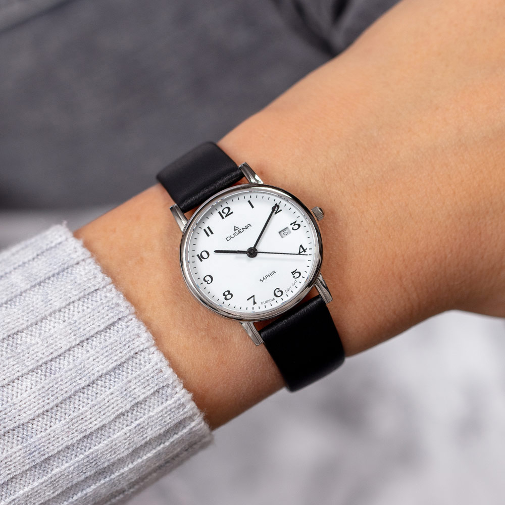 Eine traditionsreiche Unternehmensgeschichte, unaufdringliche Eleganz, ein technisch ausgefeiltes Innenleben – das alles charakterisiert DUGENA-Damen-Armbanduhren zu echten Besonderheiten, die jedes Outfit auf eine moderne Weise stilbewusst ergänzen! Auch die DUGENA Zenit umfasst jene attraktiven, auf höchsten Uhrmacher-Standards fußenden Merkmale. So unterstreicht eine Zenit die von vielen Uhrenliebhabern geschätzten und DUGENA-typischen Komponenten – etwa das mondäne Edelstahlgehäuse samt längenverstellbarem Lederarmband (mit Dornschließe), das für einen bequemen Tragekomfort sorgt.