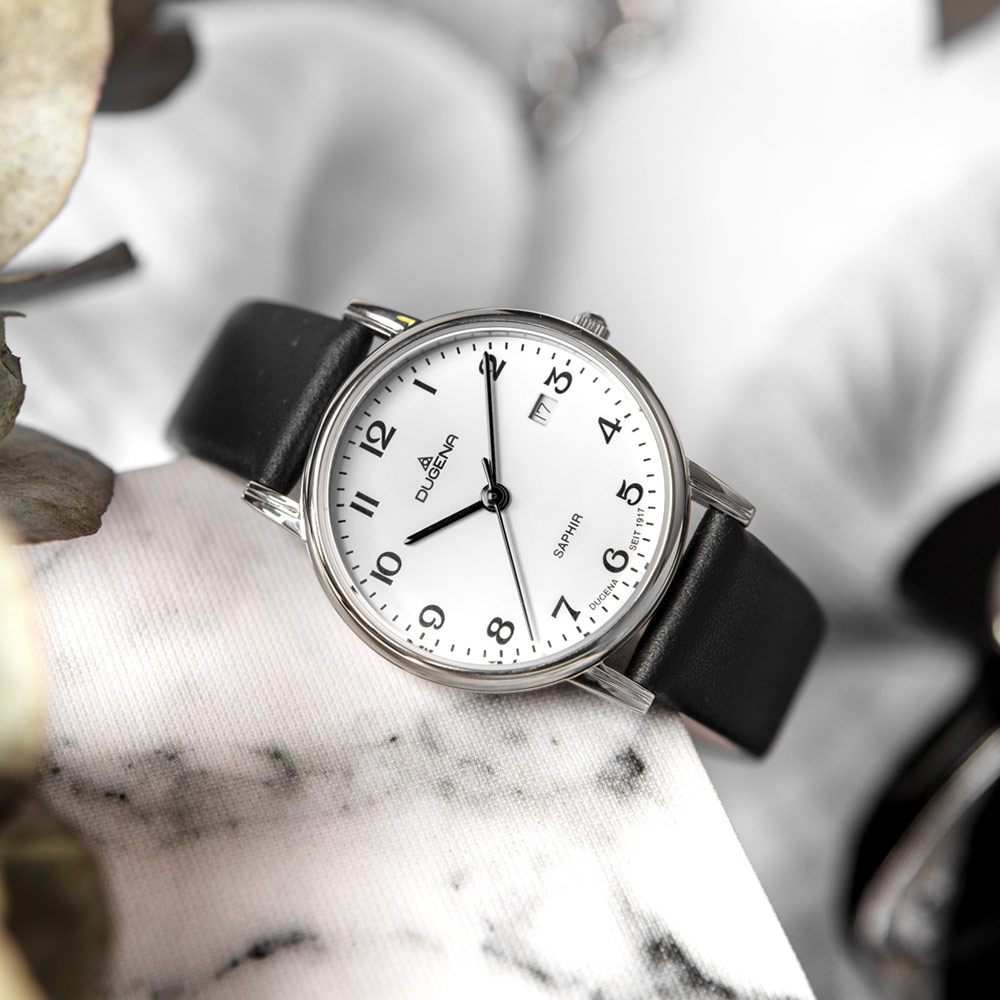 Ob Quarz, Automatik oder Handaufzug: Unsere Armbanduhren bestechen in ihren vielfältigen Ausführungen durch eine hohe technische Präzision. Auf Basis dieser soliden, sich von anderen Uhrenmarken deutlich abhebenden Qualitätsarbeit ist DUGENA seit über 100 Jahren ein fester Begriff bei Uhrenkennern. Sowohl die mit einer 42-Stunden-Gangreserve ausgestatteten Automatik- als auch die Quarzwerke namhafter Hersteller bilden mit ihrer Ganggenauigkeit die Grundlage für die erwiesene DUGENA-Klasse – optische Feinheiten wie das gehärtete Saphirglas tragen zur Exklusivität einer DUGENA eindrucksvoll bei.