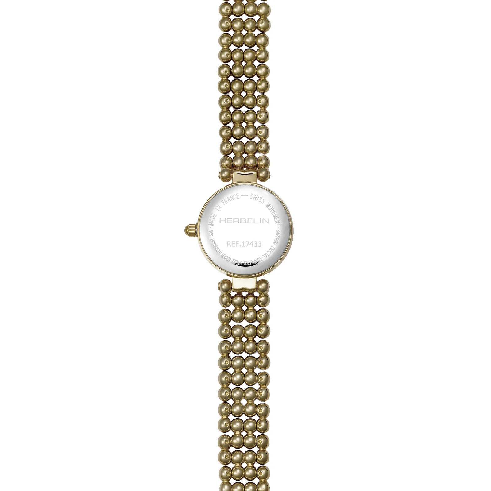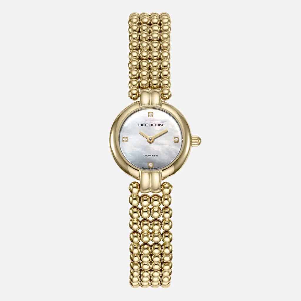 Die wunderschöne PERLES lässt die Herzen höherschlagen. Die Neuheit vereint Weiblichkeit, Eleganz und Stil par excellence. Feminin anmutend, fast wie ein Schmuckstück präsentiert sich die Gesamtkomposition in einem edlen Gelbgoldton und einem attraktiven Schmuckarmband in verspielter Perlenoptik. Das runde 21 mm große und filigrane Gehäuse offenbart ein hell schimmerndes Perlmuttzifferblatt, das mit vier echten Diamanten besetzt ist. Die PERLES ist wie alle HERBELIN Uhren mit einem namhaften Schweizer Uhrwerk ausgestattet. Sie ist aus hochwertigem und PVD-beschichteten Edelstahl gefertigt. Die PERLES ist die ideale Begleiterin für jedes Outfit und lässt sich auch beim glamourösen Auftritt, besonders zu festlichen Roben ideal kombinieren.