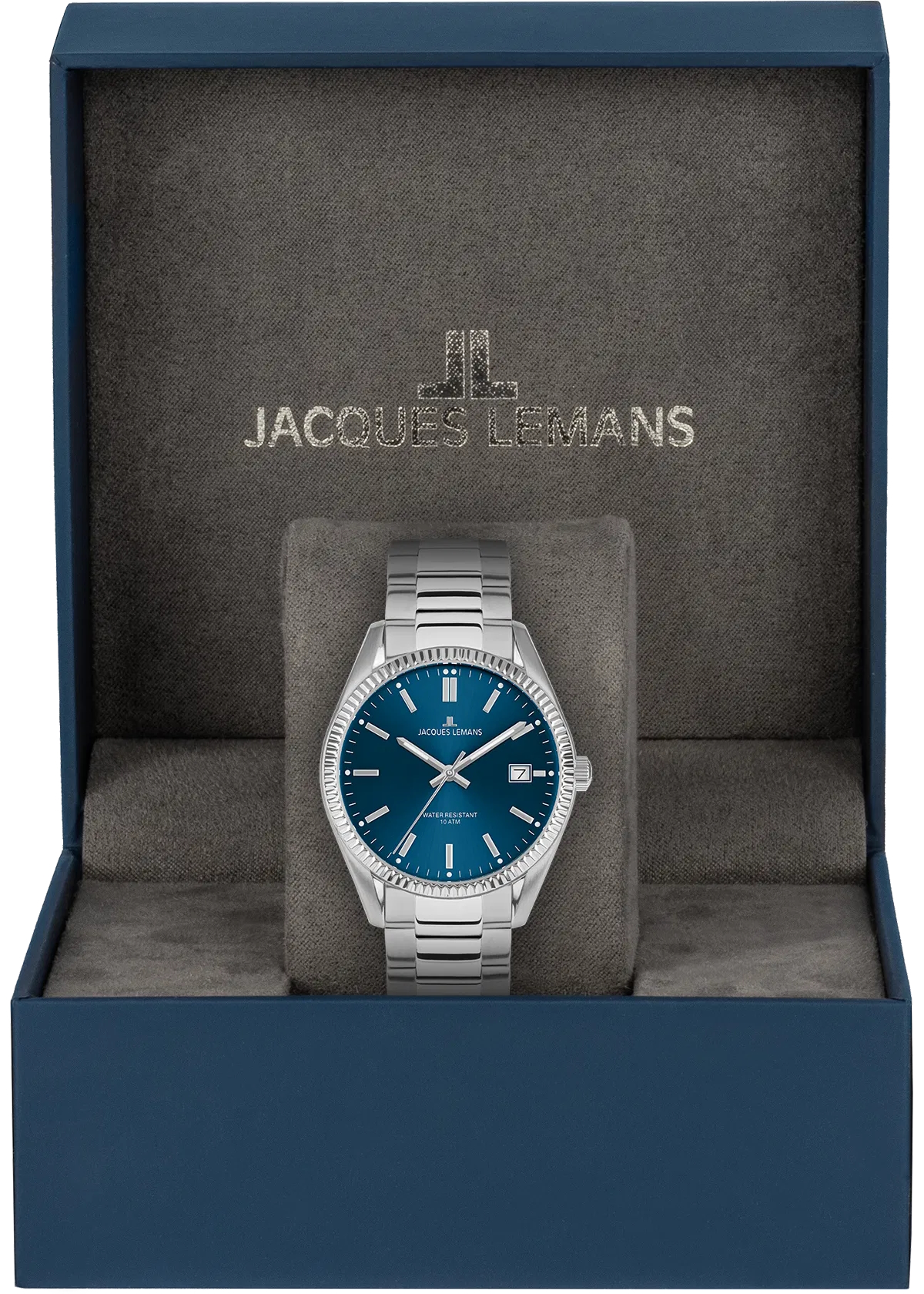Eine sportlich moderne Herrenuhr mit dem Namen Jacques Lemans 50-3B passt zu vielen Anlässen. Für einen angenehmen Tragekomfort sorgt das stabile Armband aus Edelstahl. Der Blick auf das Zifferblatt wird durch Mineralglas geschützt. Die angegebene Wasserdichtigkeit (oder auch Prüfdruck genannt) ist 10 ATM. Das Material des Gehäuses dieser eleganten Uhr besteht aus Edelstahl. Der Durchmesser des silberfarbenen Gehäuses misst 40 mm.