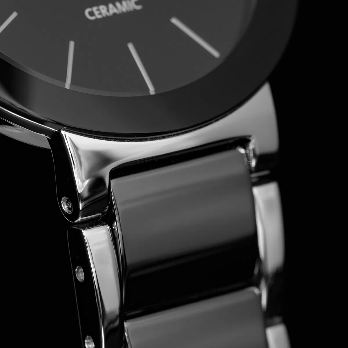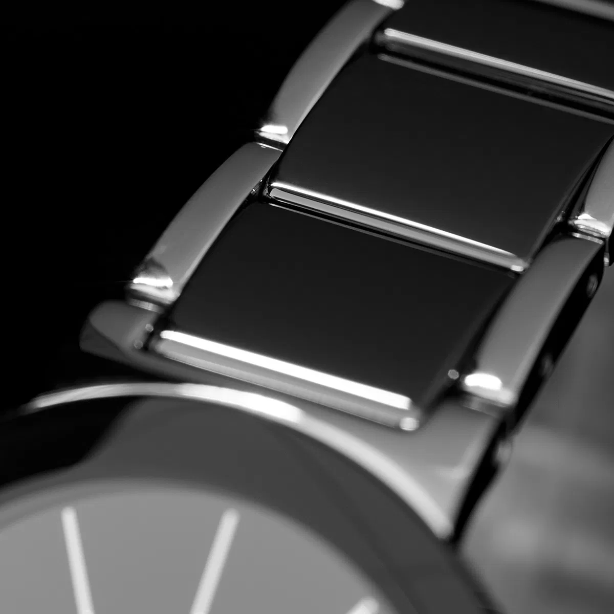 Teile dieser Uhr werden mit High-Tech Ceramic veredelt. Das hochwertige Material ist um ein Vielfaches härter als Edelstahl und sorgt dafür, dass sie auch nach Jahren ihren Glanz beibehält.