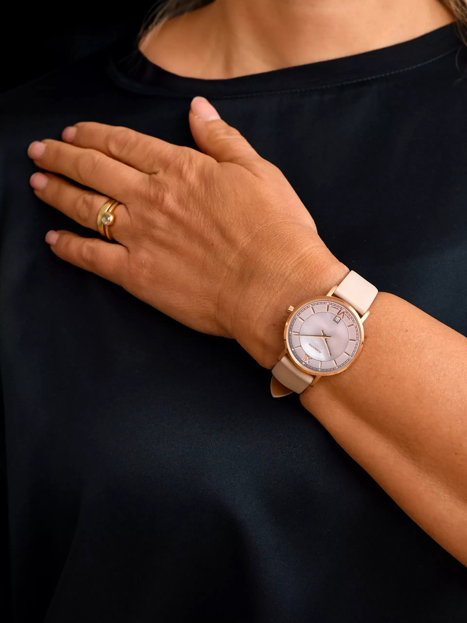 Elegante römische Ziffern kombiniert mit schimmerndem Perlmutt 34 mm Lederarmband Saphirglas Ref. 962.03.09