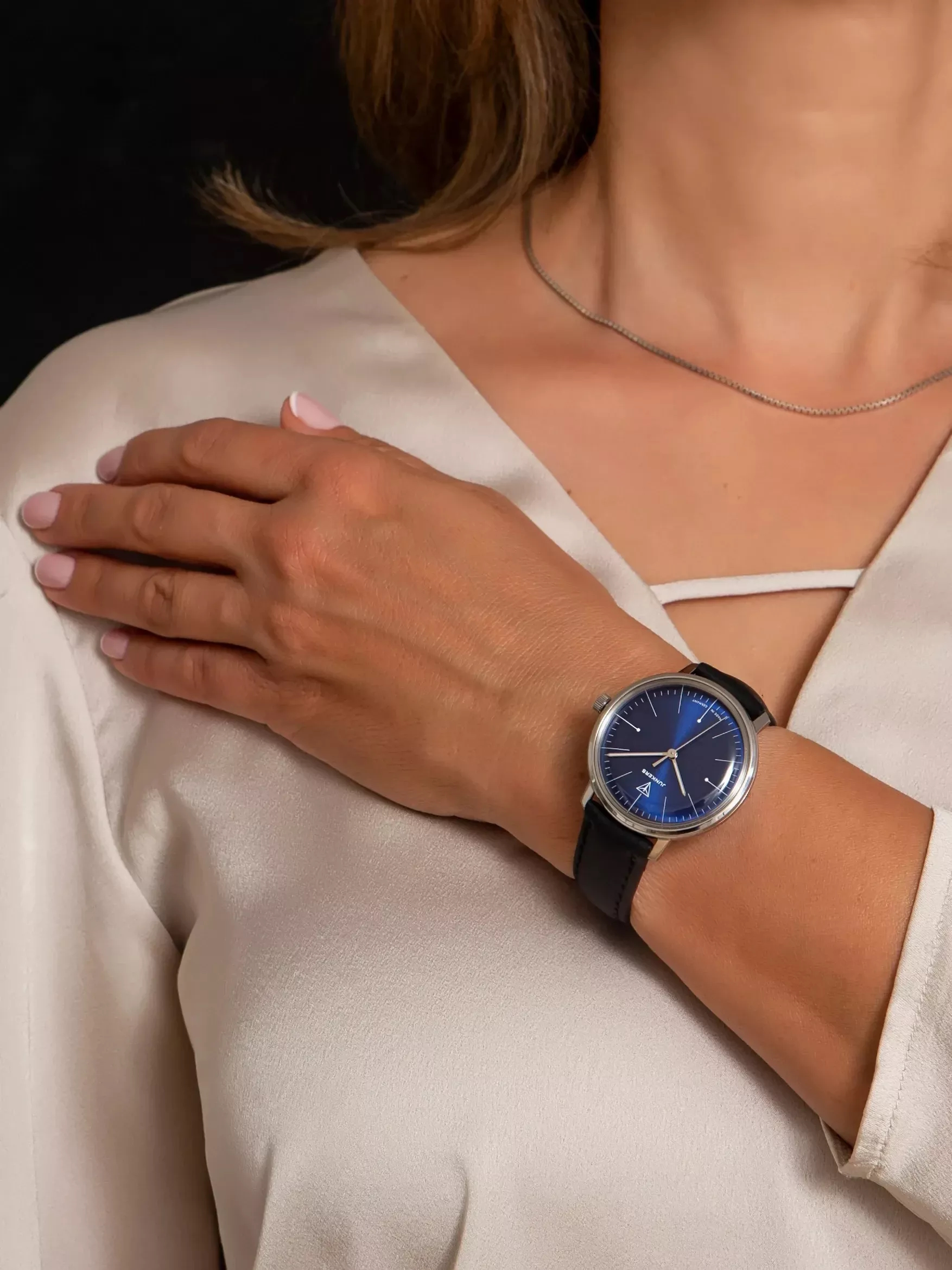 Designklassiker Farbe blau 38 mm Lederarmband gewölbtes Glas und Zifferblatt Ref. 906.01.01