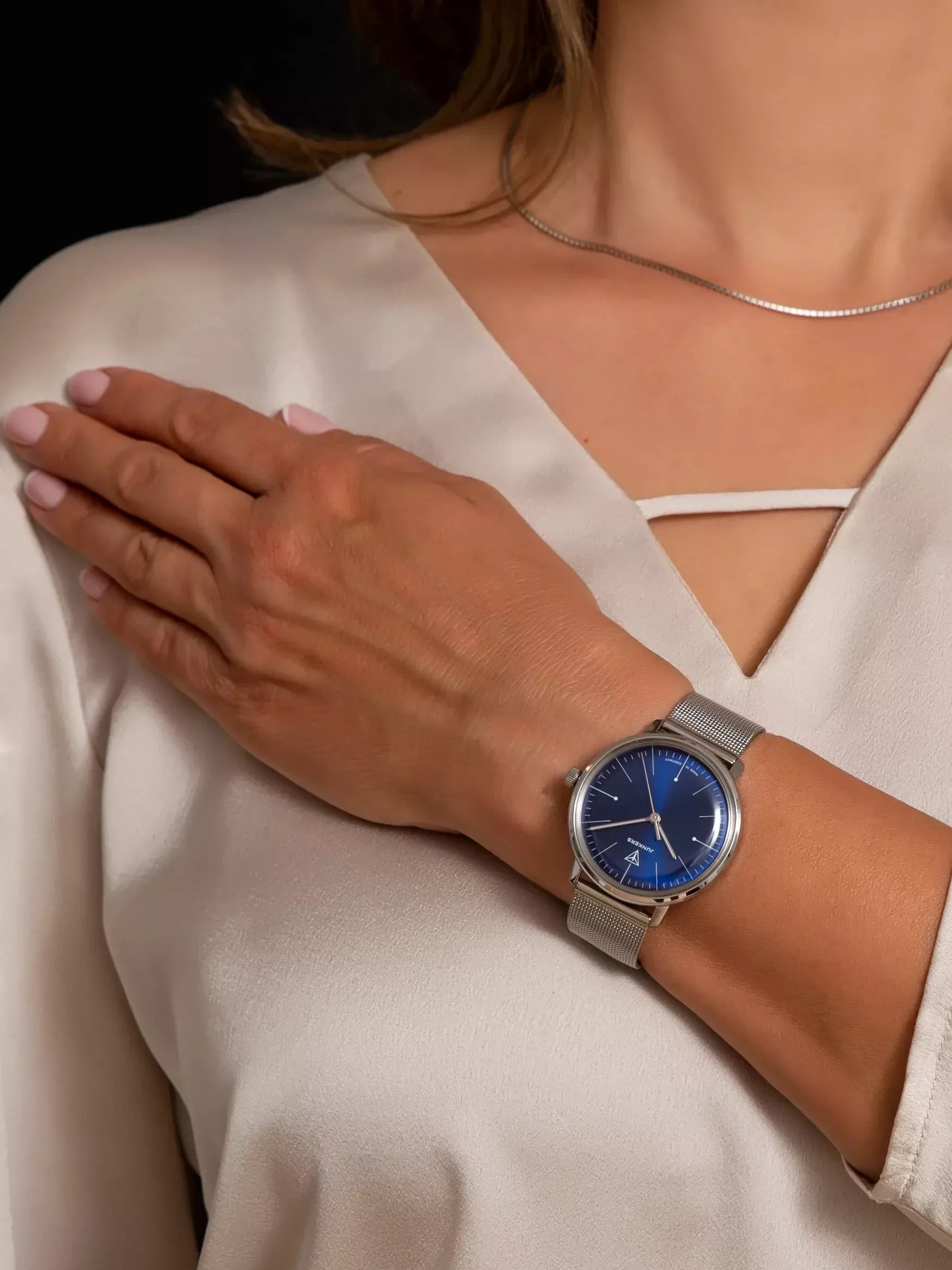 Designklassiker Farbe blau 38 mm Milanaise-Armband gewölbtes Glas und Zifferblatt Ref. 906.01.01