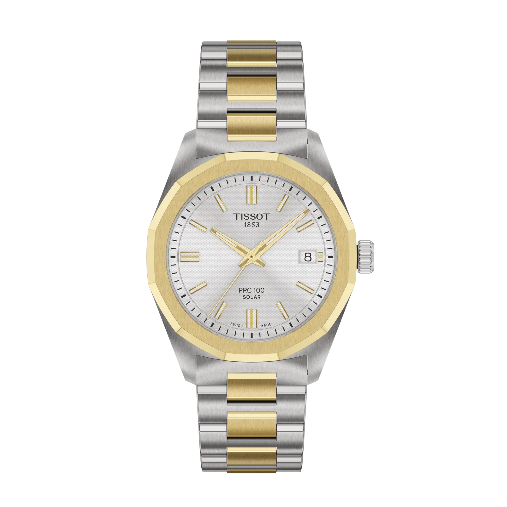 Diese Tissot PRC 100 Solar 34mm Ausführung besitzt ein silberfarbenes Zifferblatt mit Datumsanzeige. Das ebenso massive wie flexible 316L-Edelstahlarmband mit gelbgoldfarbener PVD-Beschichtung mit Butterfly-Faltschließe mit Drückern hält die Uhr sicher am Handgelenk.