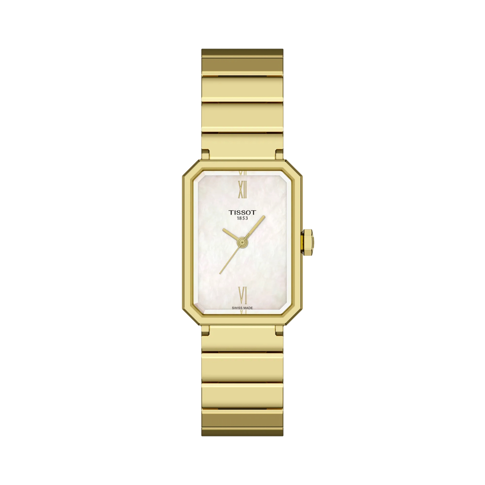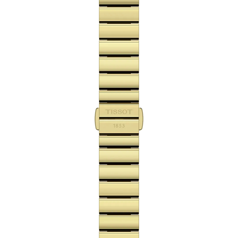 Diese Ausführung der Tissot SRV besitzt ein 316L-Edelstahlgehäuse und -armband mit gelbgoldfarbener PVD-Beschichtung sowie ein weißes Perlmuttzifferblatt mit römischen Ziffern bei 12 und 6 Uhr.