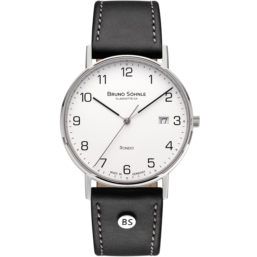 Quarzwerk in veredelter Bruno Söhnle-Ausführung (Basiswerk Ronda 6003.D), Edelstahl, Ø 38,0 mm, Höhe 6,55 mm, 3 bar, Saphirglas innen entspiegelt, Rindsleder schwarz, Dornschließe