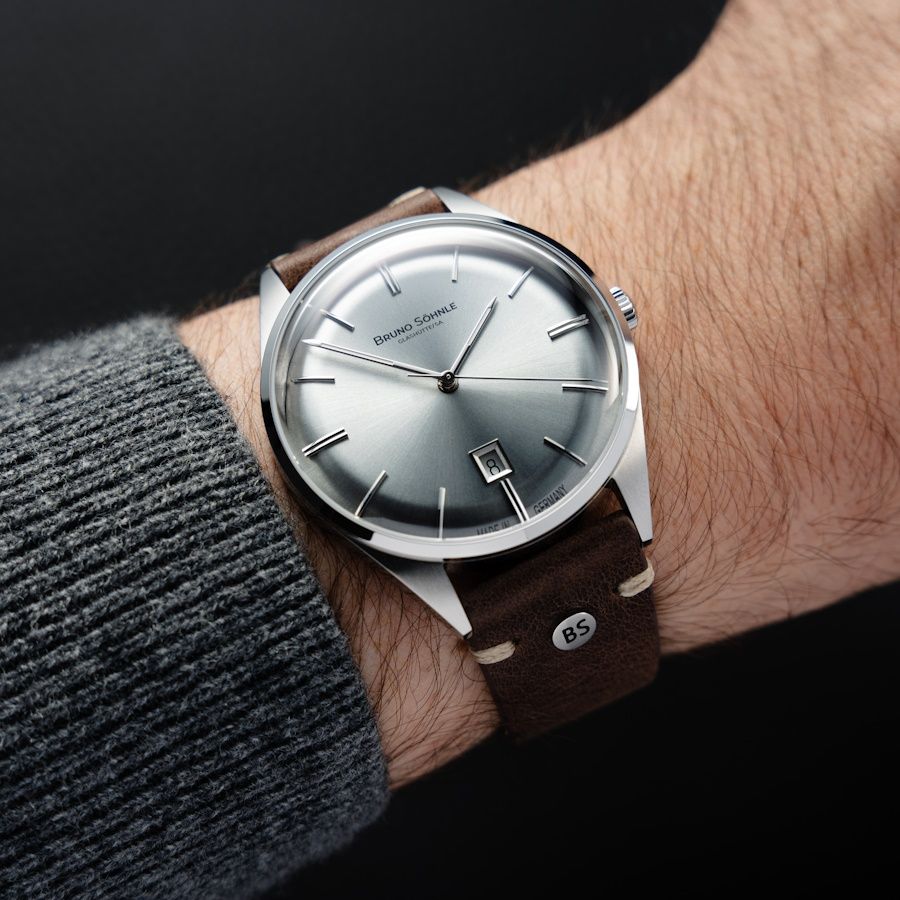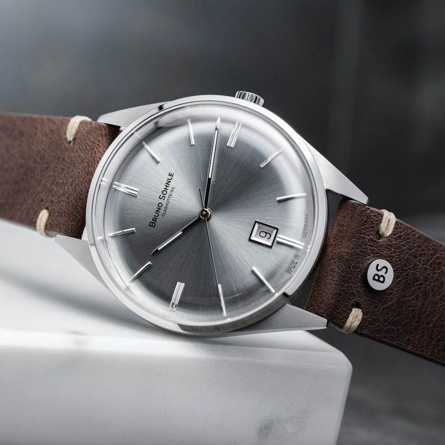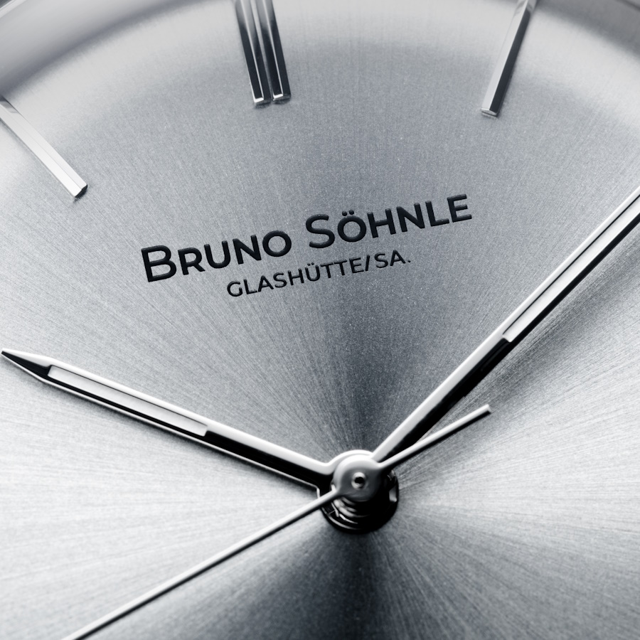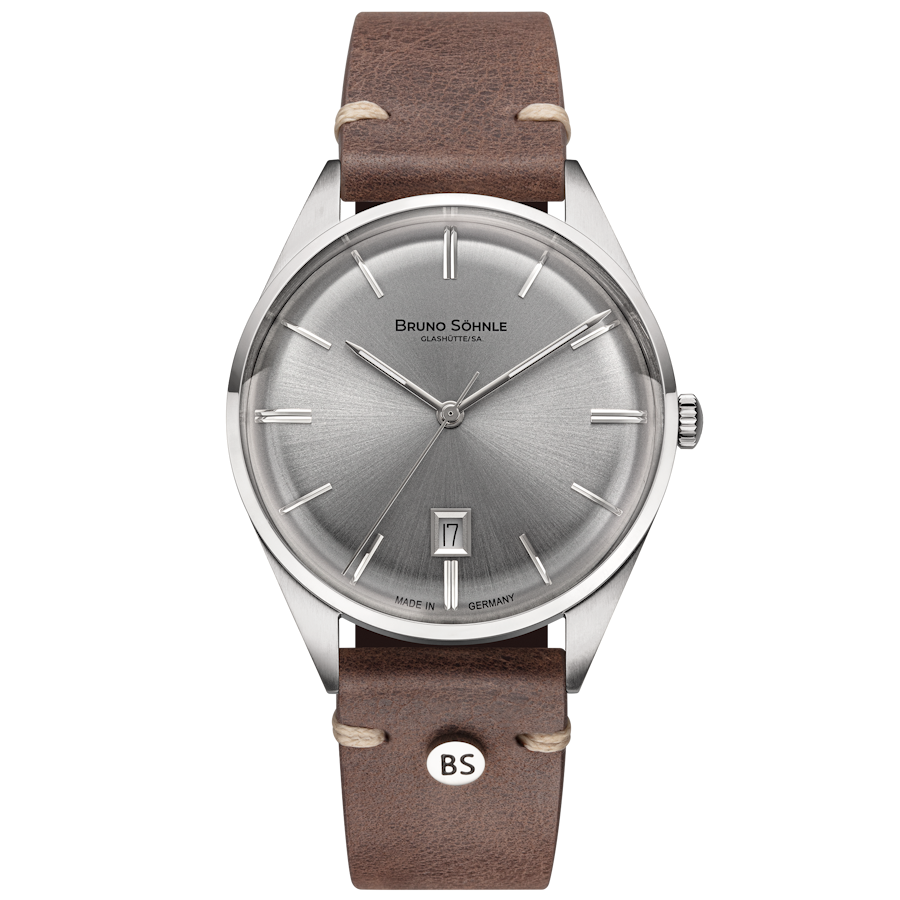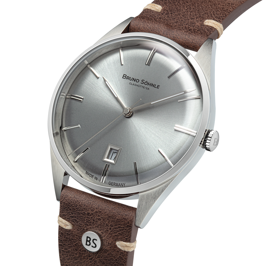 Die MERANO kombiniert stilvolle Eleganz mit einem Hauch von Retro-Charme. Das silberfarbene, gewölbte Zifferblatt ist mit einem edlen Sonnenschliff versehen und zeigt silberne Zeiger sowie applizierte silberne Indexe, die für ein harmonisches Design sorgen. Bei 6 Uhr befindet sich eine Datumsanzeige, die von einem ebenfalls applizierten Rahmen umgeben ist. Das 40 mm große Edelstahlgehäuse wird durch ein weiches Lederarmband in der Farbe "Mokka" ergänzt, was der Uhr eine warme und luxuriöse Note verleiht. Im Inneren arbeitet ein veredeltes Quarzwerk in der Bruno Söhnle Version, das sich durch den charakteristischen Glashütter Streifenschliff und thermisch gebläute Schrauben auszeichnet. Diese Uhr ist die perfekte Mischung aus klassischem Design und modernen Akzenten.