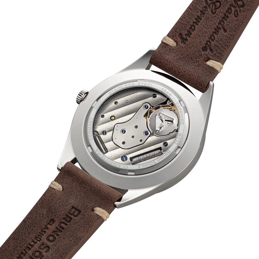 Quarzwerk in veredelter Bruno Söhnle-Ausführung (Basiswerk Ronda 6003.D), Edelstahl, Ø 40,0 mm, Höhe 10,5 mm, 5 bar, Saphirglas innen entspiegelt, Kalbsleder Dunkelbraun (Mokka), Dornschließe
