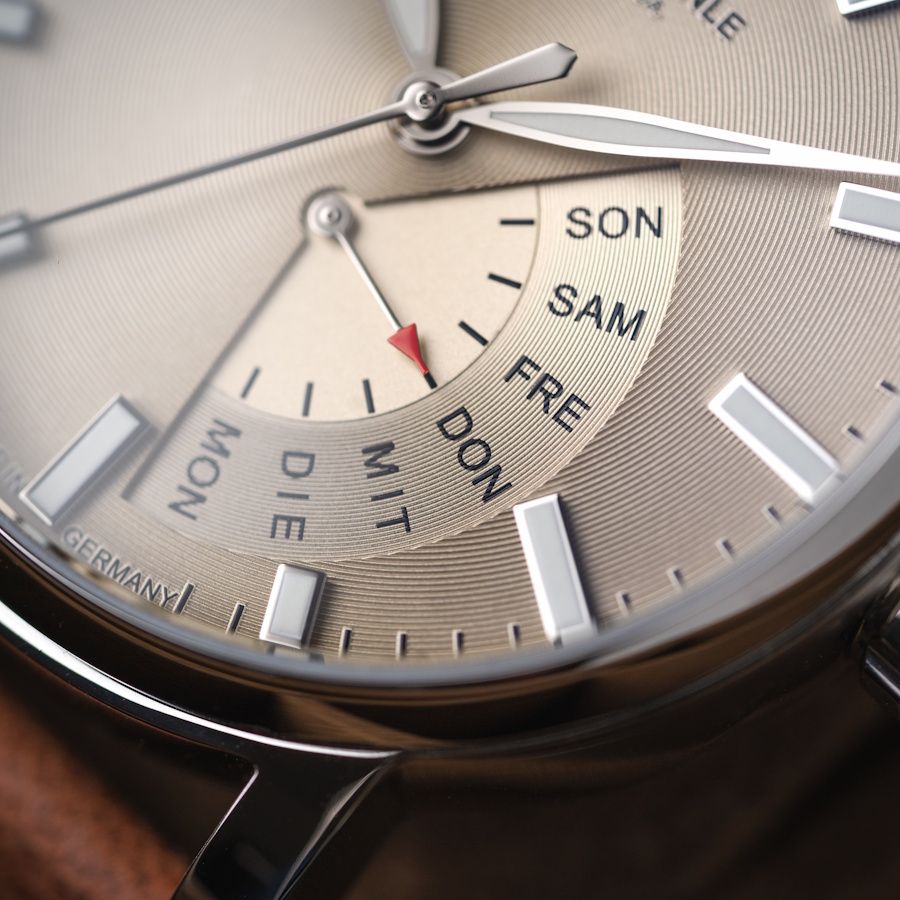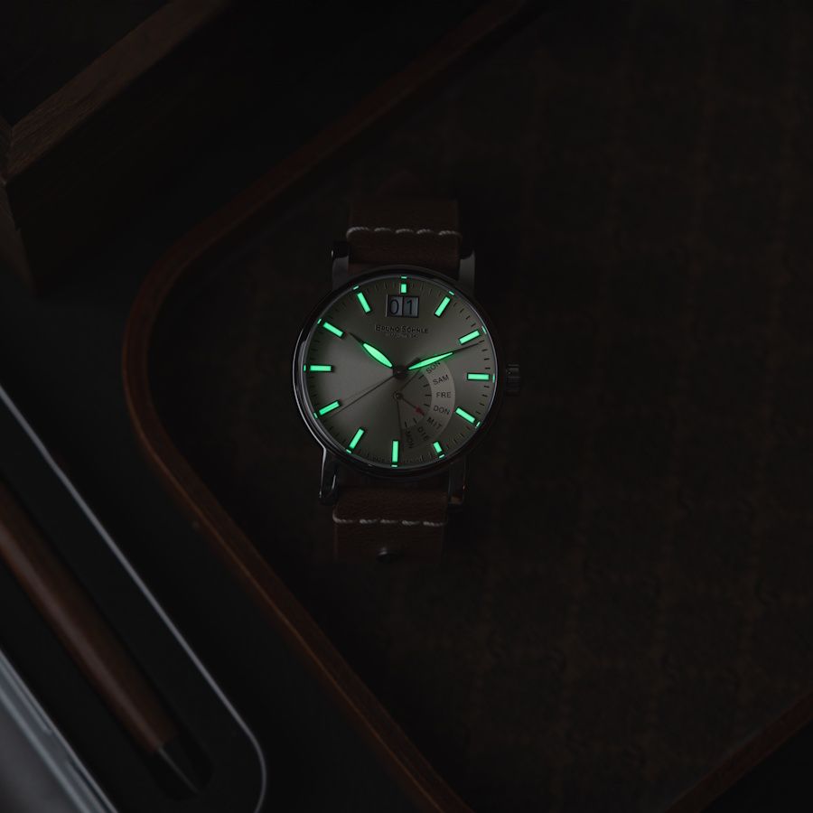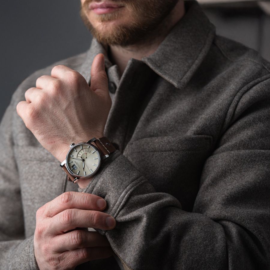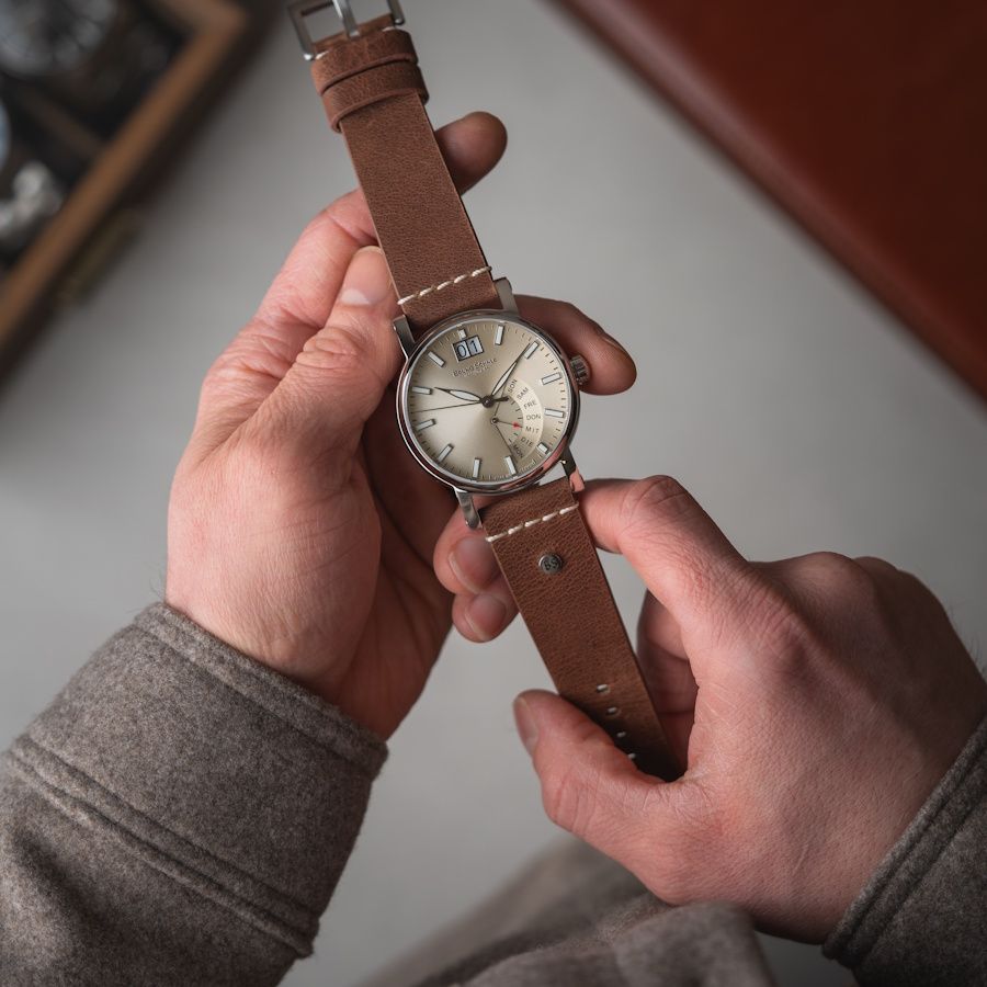 Mit ihrem warmen Beige-Ton verleiht die Pesaro I (2025) dem Handgelenk klassische Eleganz. Das Vintage-Lederband rundet das harmonische Erscheinungsbild ab und sorgt für angenehmen Tragekomfort.
