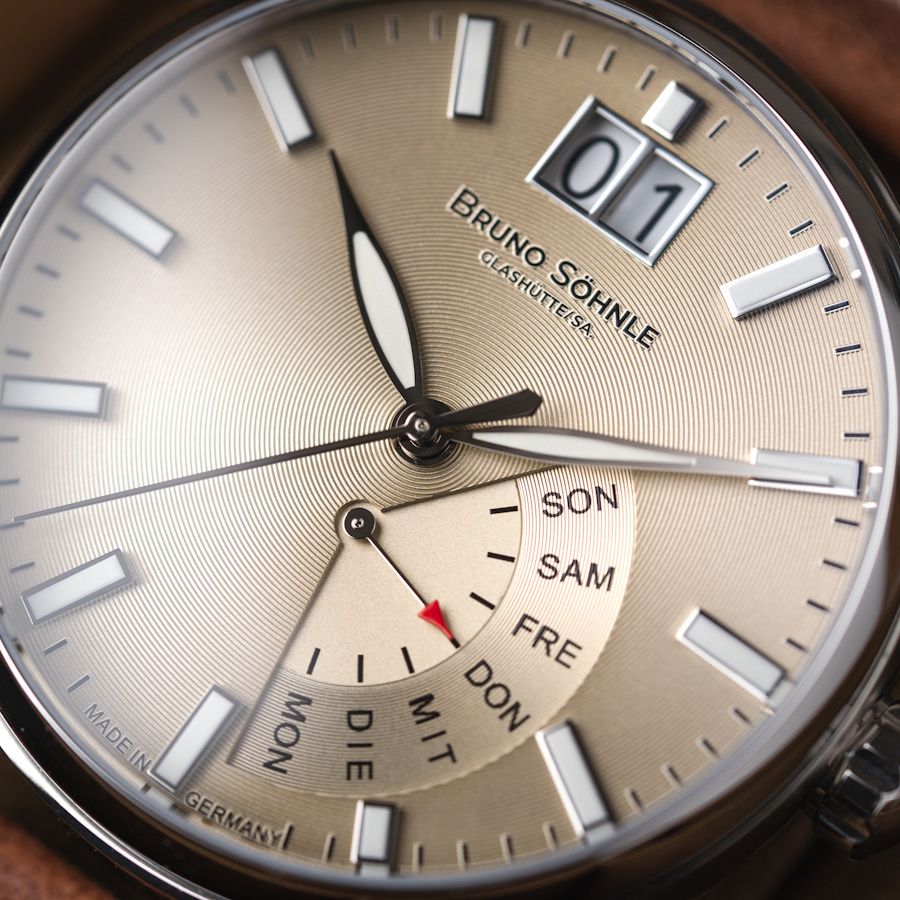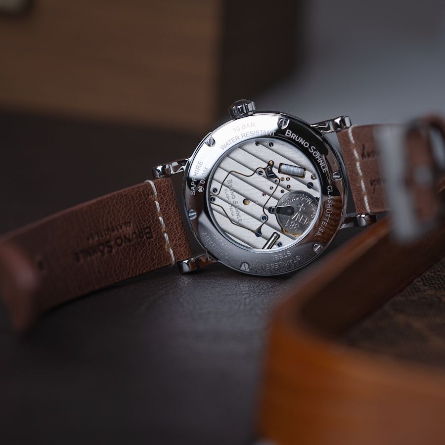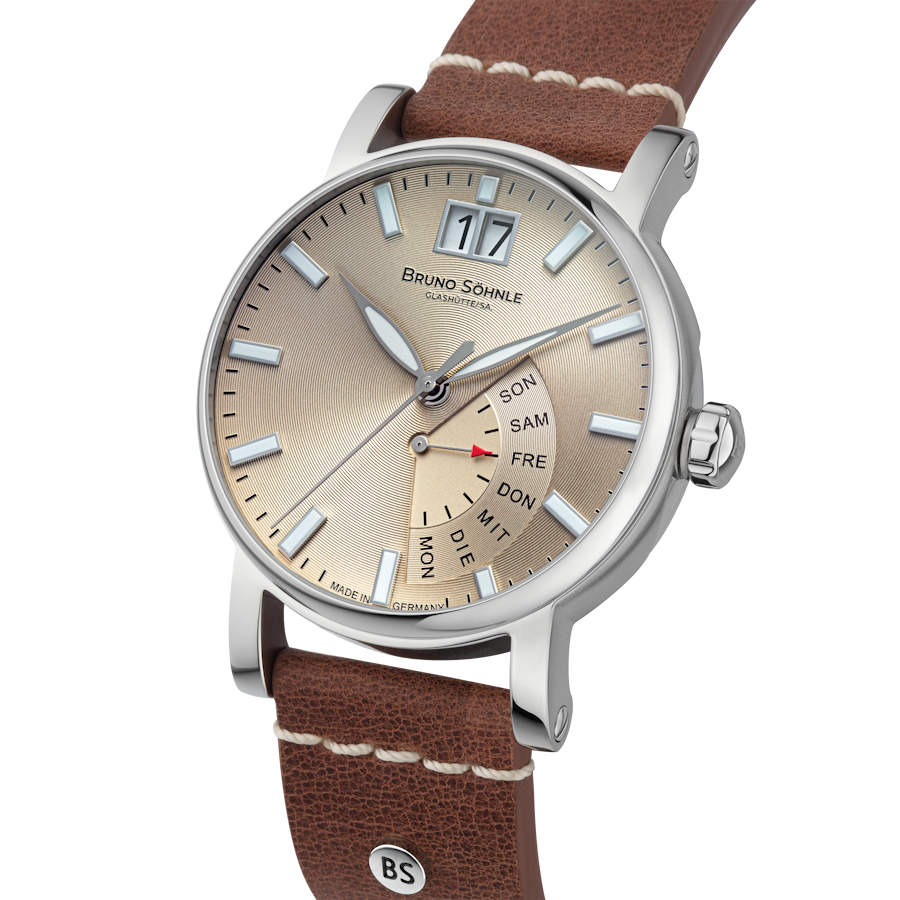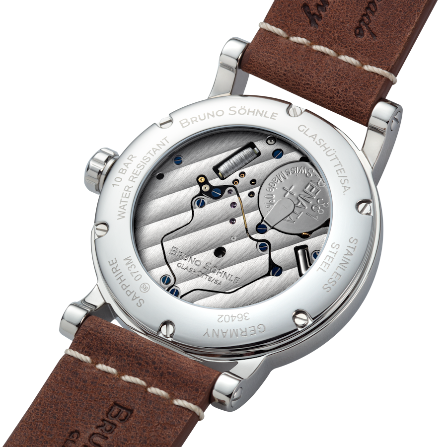 Quarzwerk in veredelter Bruno Söhnle-Ausführung (Basiswerk Ronda 7003.L), Gehäuse Edelstahl, Ø 43,0 mm, Höhe 13,65 mm, 10 bar, Saphirglas innen entspiegelt, Kalbslederband braun (mahagoni), Dornschließe