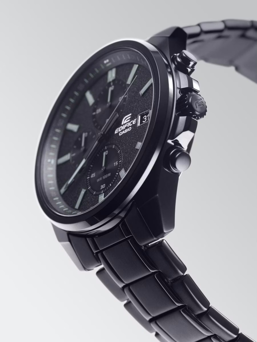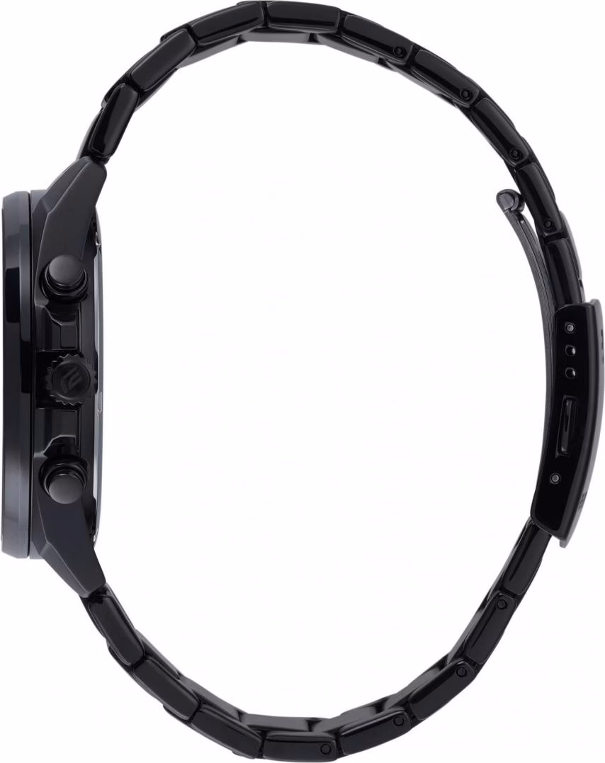 Der elegante Chronograph zeichnet sich durch ein modernes, schlichtes Design aus und hat eine einfach gehaltene dünne Lünette und ein großes Ziffernblatt. Gehäuse und Armband haben ein schwarz ionisiertes und kratzfestes Finish.
