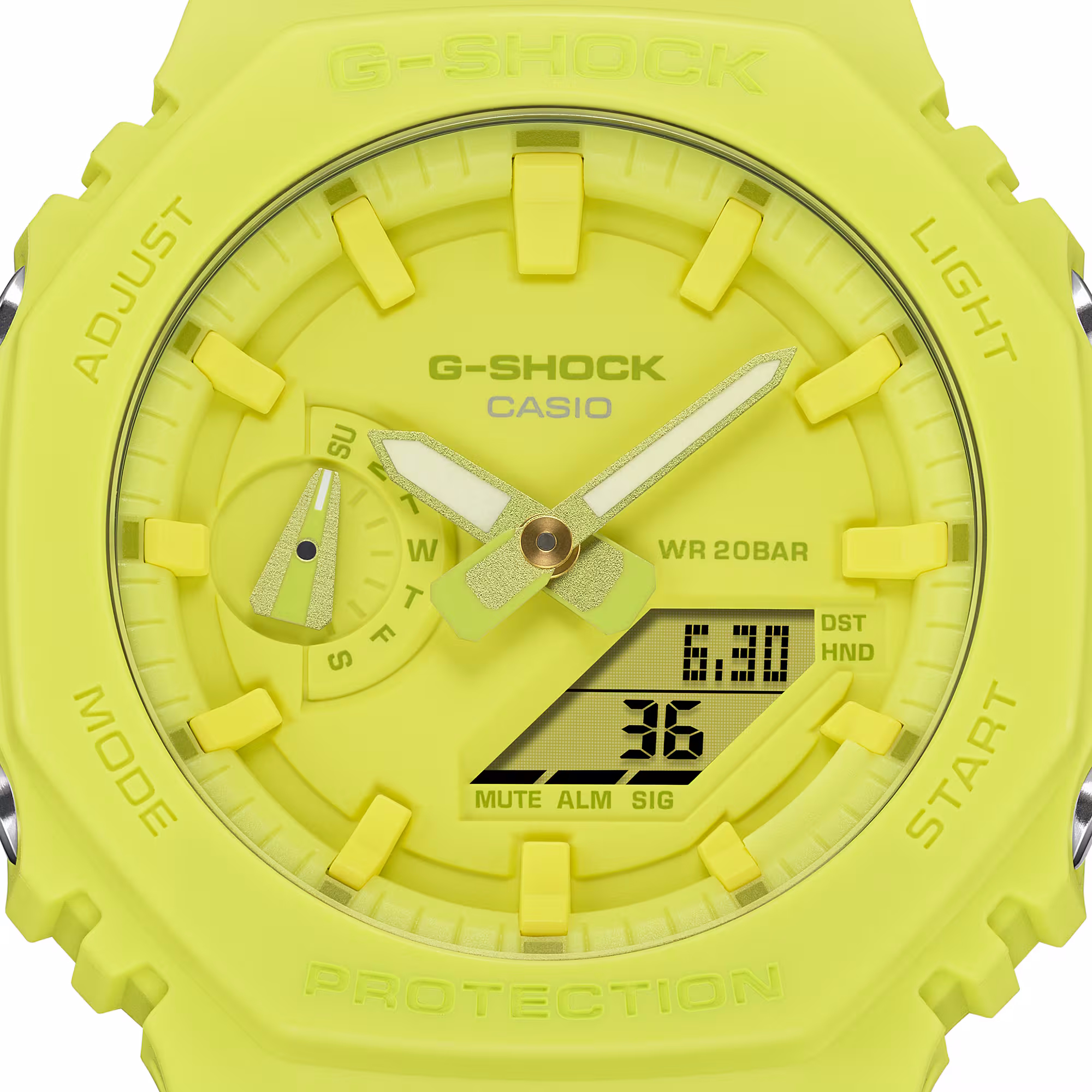 Die GA-2100 mit ihrem kultigen Tone-on-Tone Stil ist in drei beliebten Farben erhältlich: Türkis, Weiß und Volt-Gelb. Gehäuse, Lünette, Armband und sogar die einzelnen Zifferblattkomponenten sind in subtil unterschiedlichen Farbschattierungen derselben Farbe gefertigt und bieten so ein monochromatisches Aussehen mit erstaunlicher Tiefe und Dimension.
