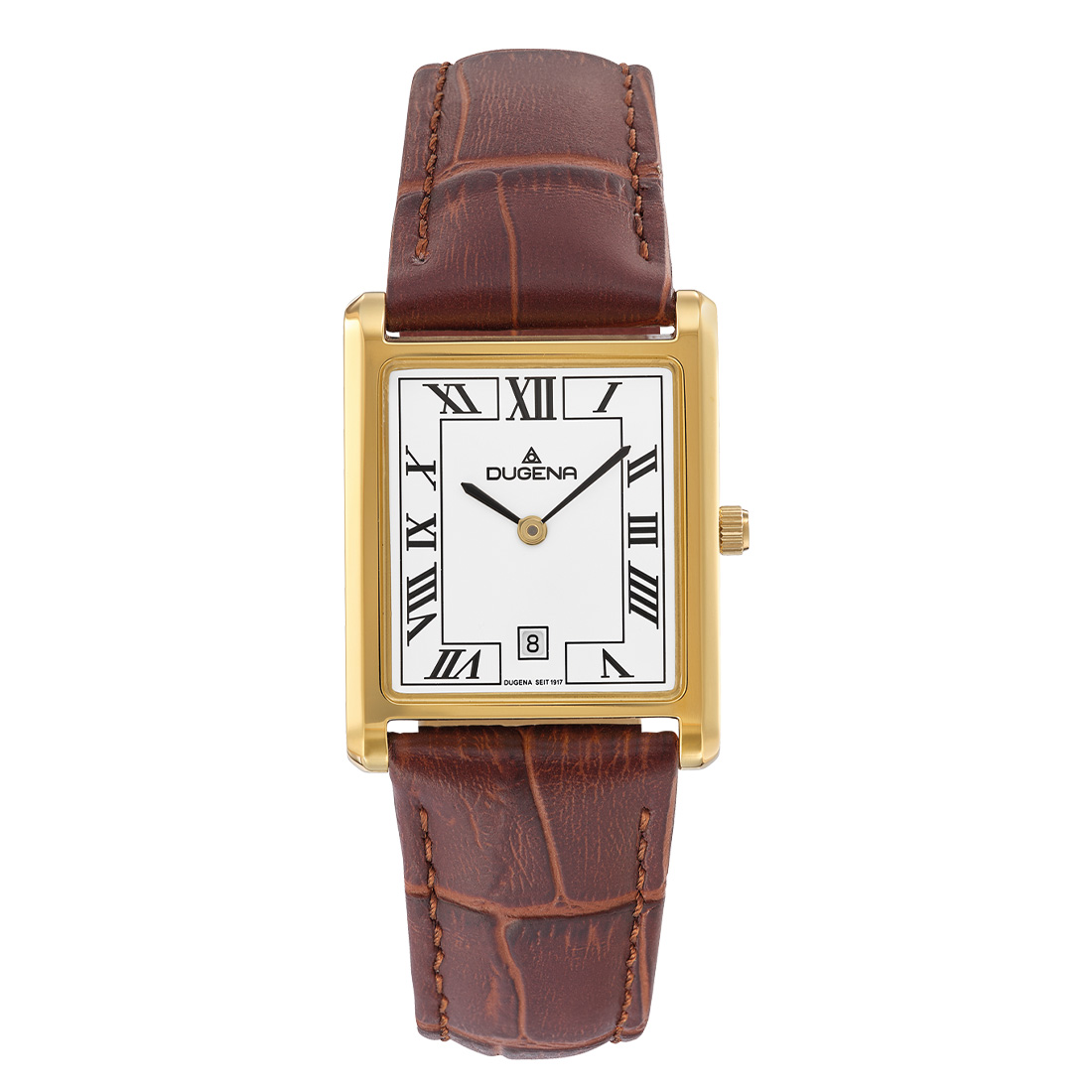 Eine große Unternehmensgeschichte, unaufdringliche Eleganz, ein technisch ausgefeiltes Innenleben – das alles charakterisiert DUGENA-Armbanduhren zu echten Besonderheiten, die Ihr Outfit auf eine moderne Weise ergänzen! Auch die DUGENA Quadra Classica umfasst jene attraktiven, auf höchsten Uhrmacher-Standards fußenden Merkmale. So unterstreicht eine Quadra Classica die von vielen Uhrenliebhaberinnen geschätzten und DUGENA-typischen Komponenten – etwa das goldene Edelstahlgehäuse samt formschönem braunem Lederarmband (mit Dornschließe, Logogravur), das für einen bequemen Tragekomfort sorgt.