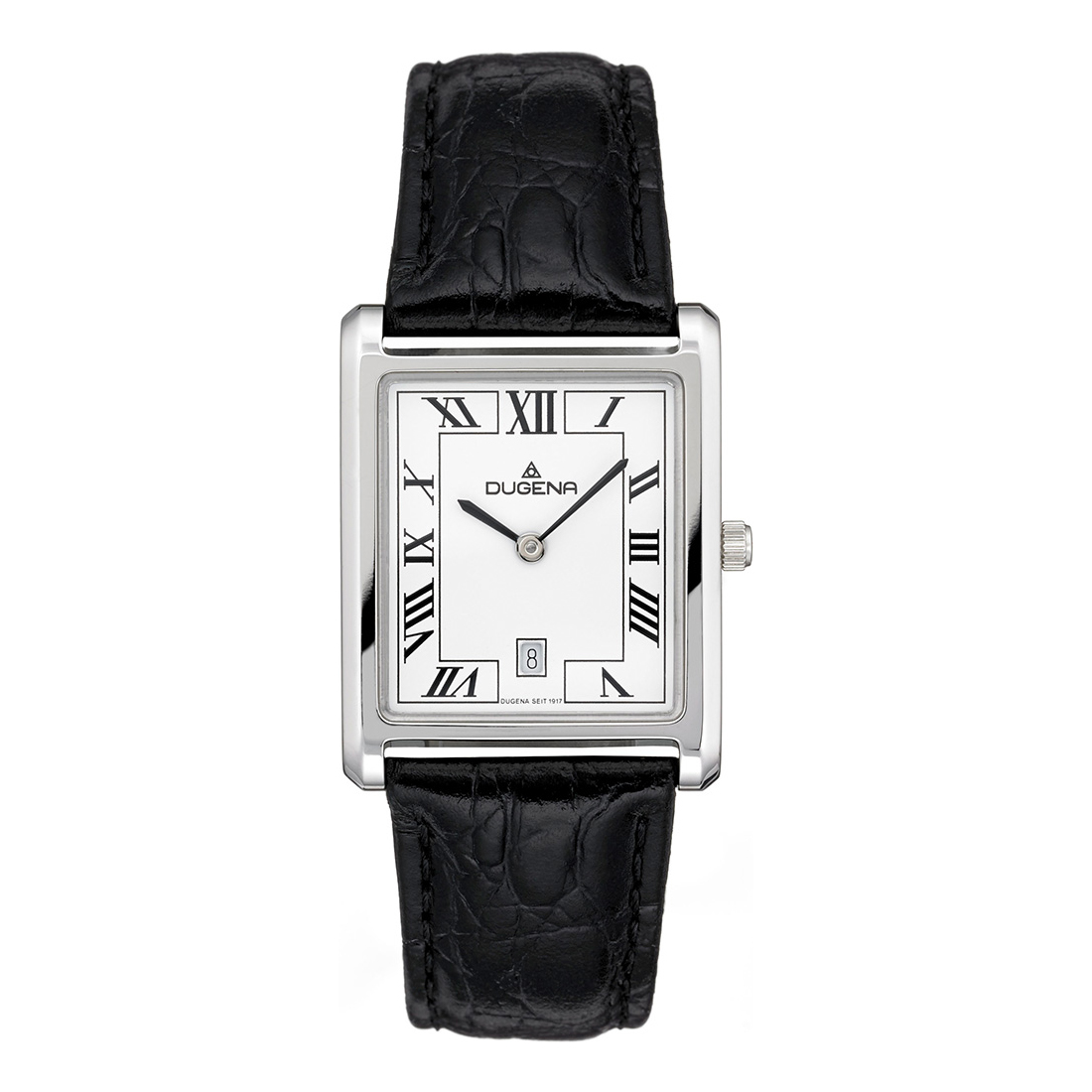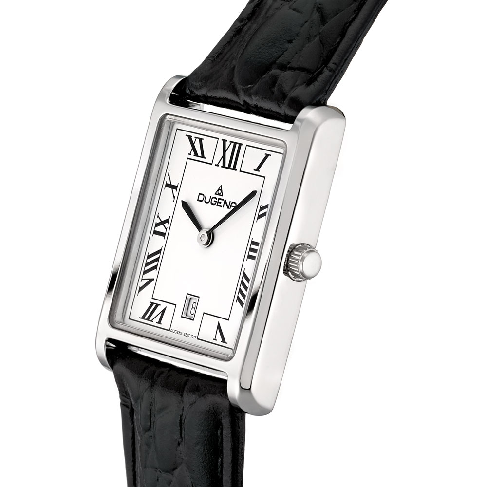 Geradlinig, schick, unverkennbar DUGENA: Hinter edlem Mineralglas zeugt das weiße Zifferblatt, ausgestaltet mit erhabenen schwarzen Ziffern sowie mit schwarzen Zeigern, von einer zeitlos schönen Optik, die an die Periode des Art Déco in den 20er-40er-Jahren erinnert. Ein Hingucker!