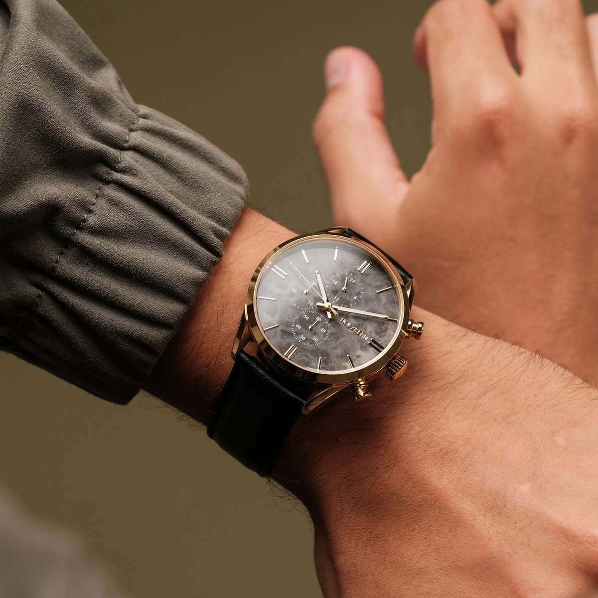 Spezielle Pigmente absorbieren UV- oder Kunstlicht und bringen das Zifferblatt zum Leuchten. So begleitet dich dein Stück Natur nicht nur durch deinen Tag, sondern ist dir auch in den Abend- und Nachtstunden ein treuer Begleiter, der genaues Ablesen der Zeit verspricht. Verbringe Zeit an hellen Orten und bringe dein Stück Natur bei Dunkelheit zum Strahlen!