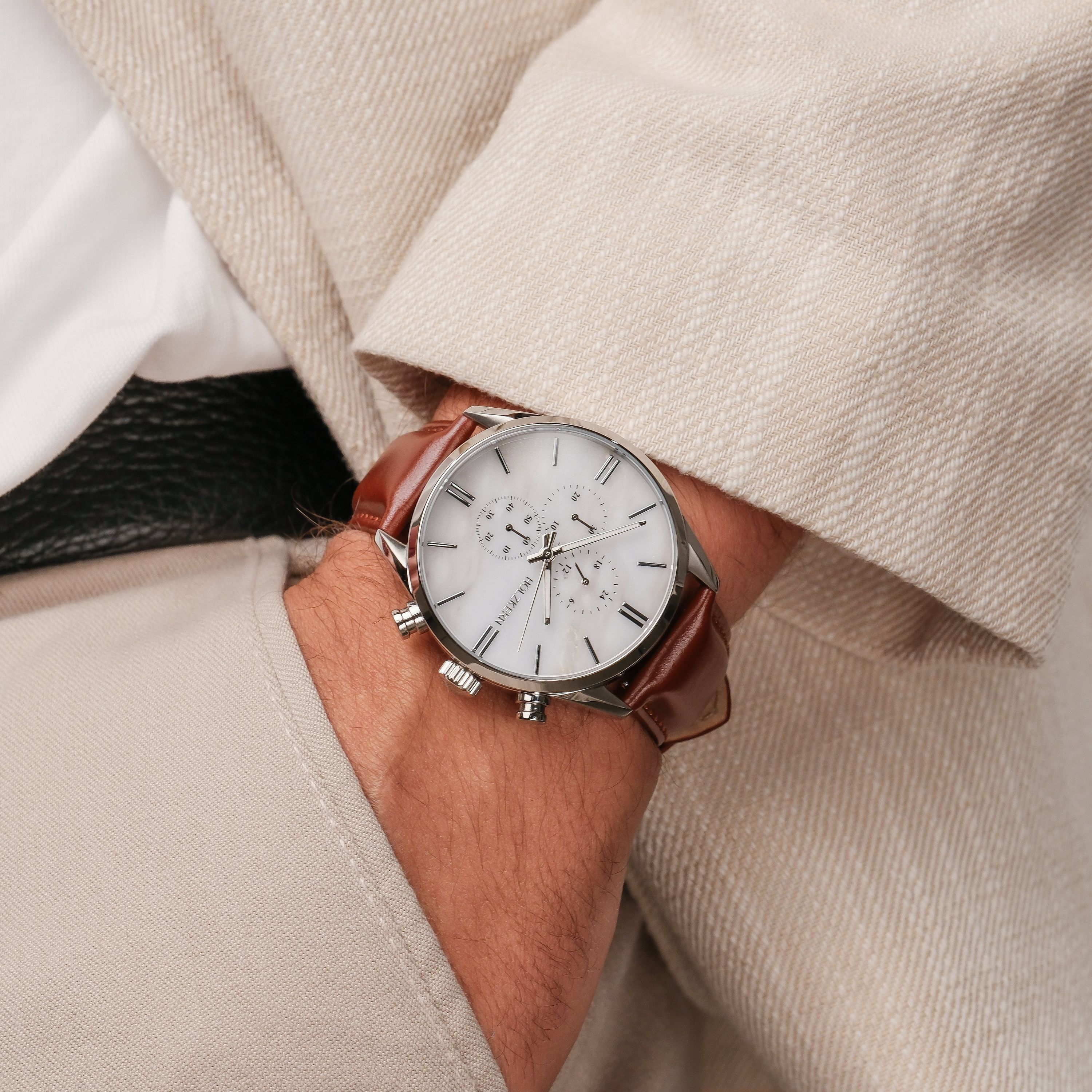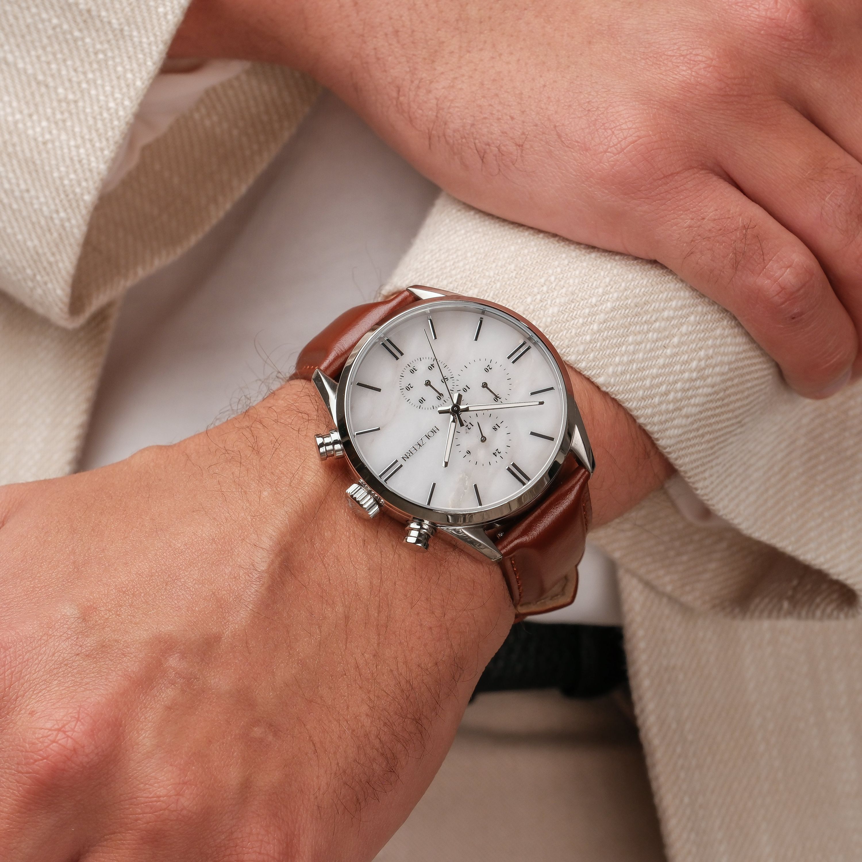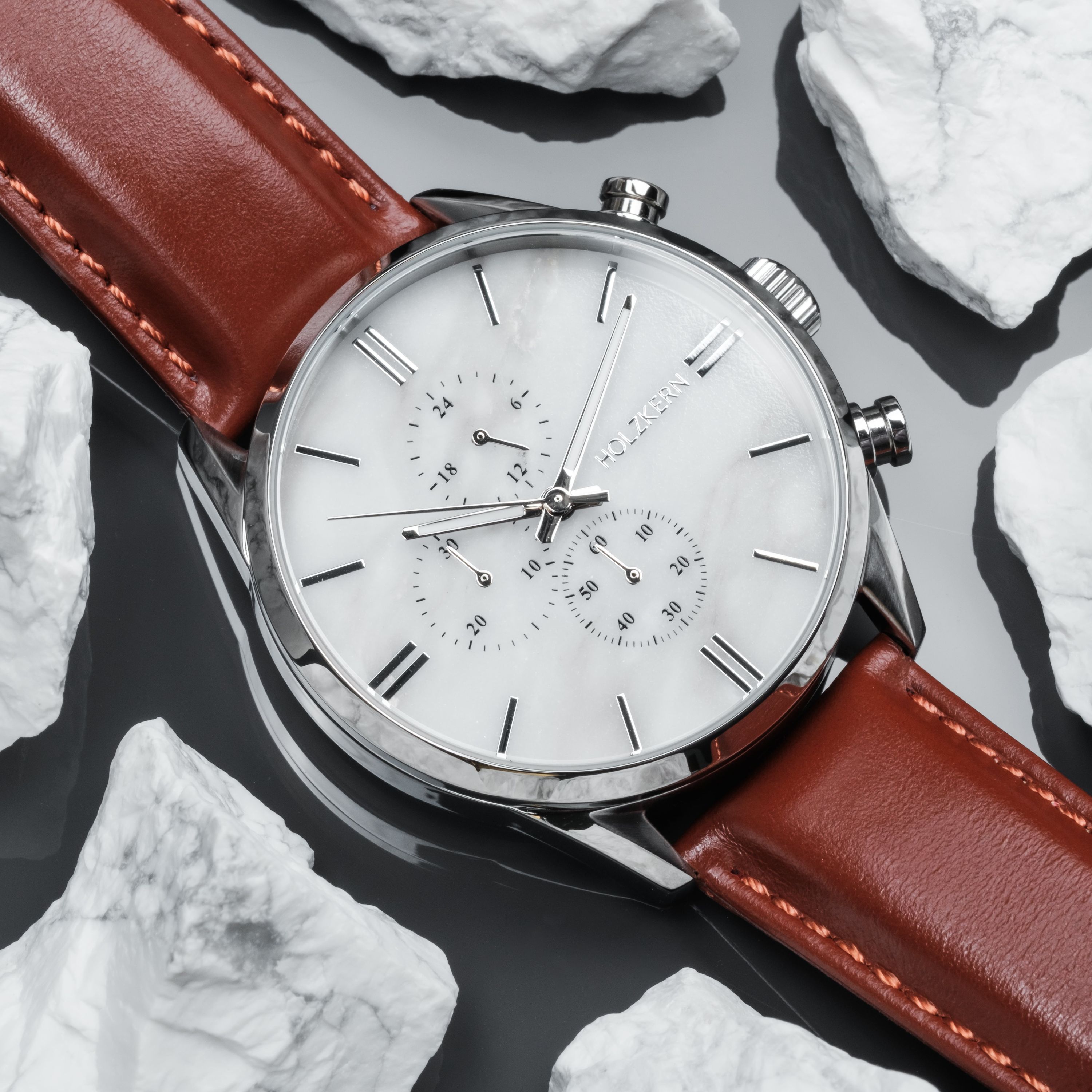 Ein Hauch von Luxus. Der Name „Marmor“ stammt vom griechischen Wort „mármaros“, was „leuchtender Stein“ bedeutet. Die Geschichte des Marmors geht bis zur antiken griechischen und römischen Kunst zurück, wo Marmor für Skulpturen und Architektur verwendet wurde. Mit seiner charakteristischen Struktur und Farbgebung sorgt Marmor für ein besonders ästhetisches Erscheinungsbild, das unsere Uhren und Schmuckstücke aus diesem Stein zu ganz besonderen Statement-Pieces macht.