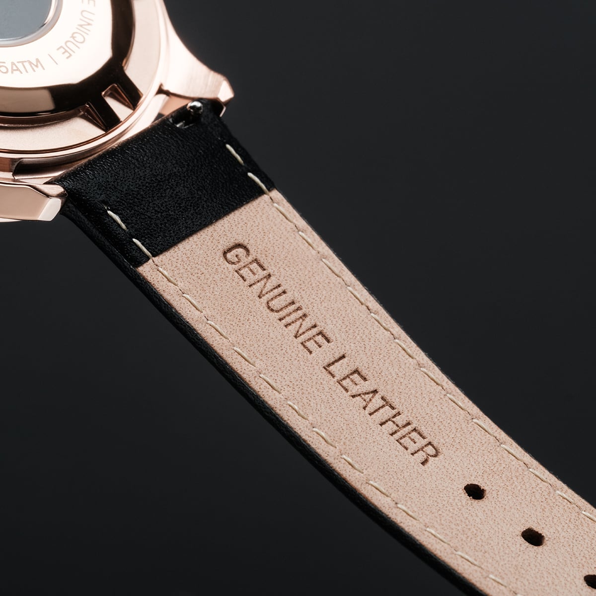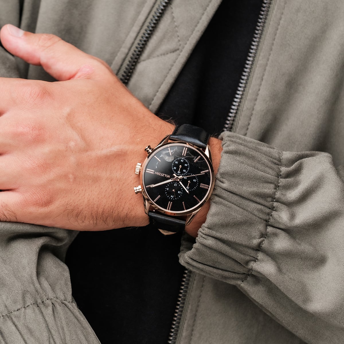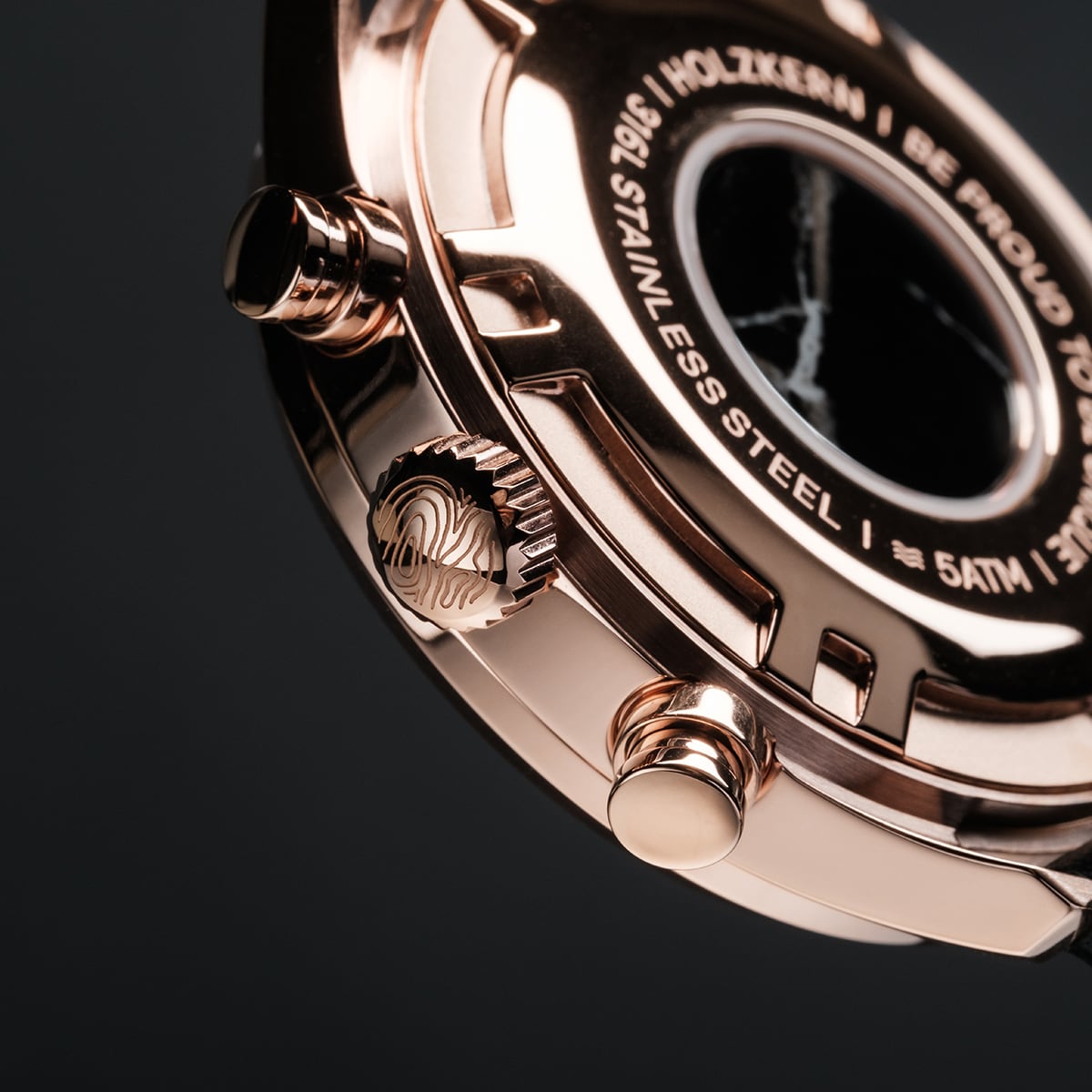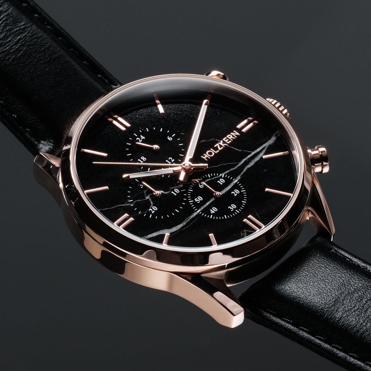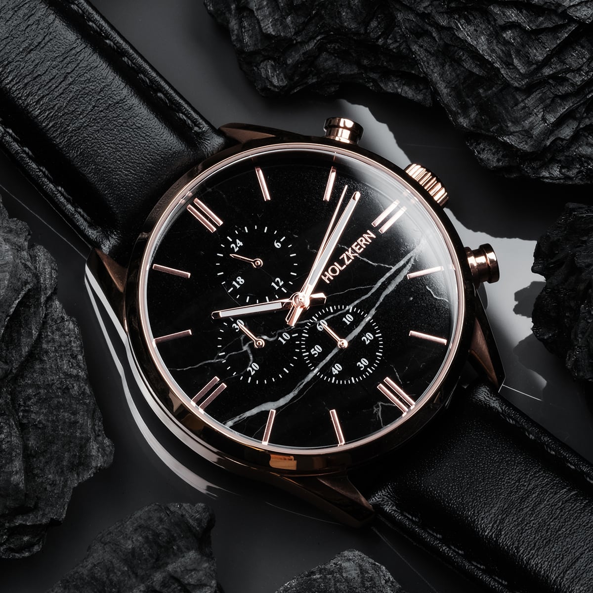 Wie die Nacht in Manifestation liegt schwarzer Marmor auf deinem Zifferblatt – geheimnisvoll, tief und voller Struktur. Roségoldene Details durchbrechen die Dunkelheit und bringen das gesamte Design zum Strahlen.