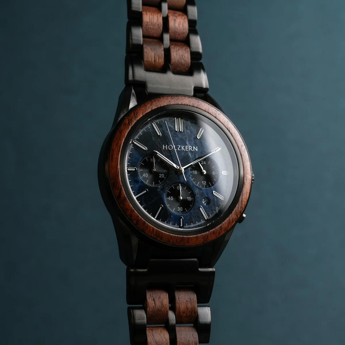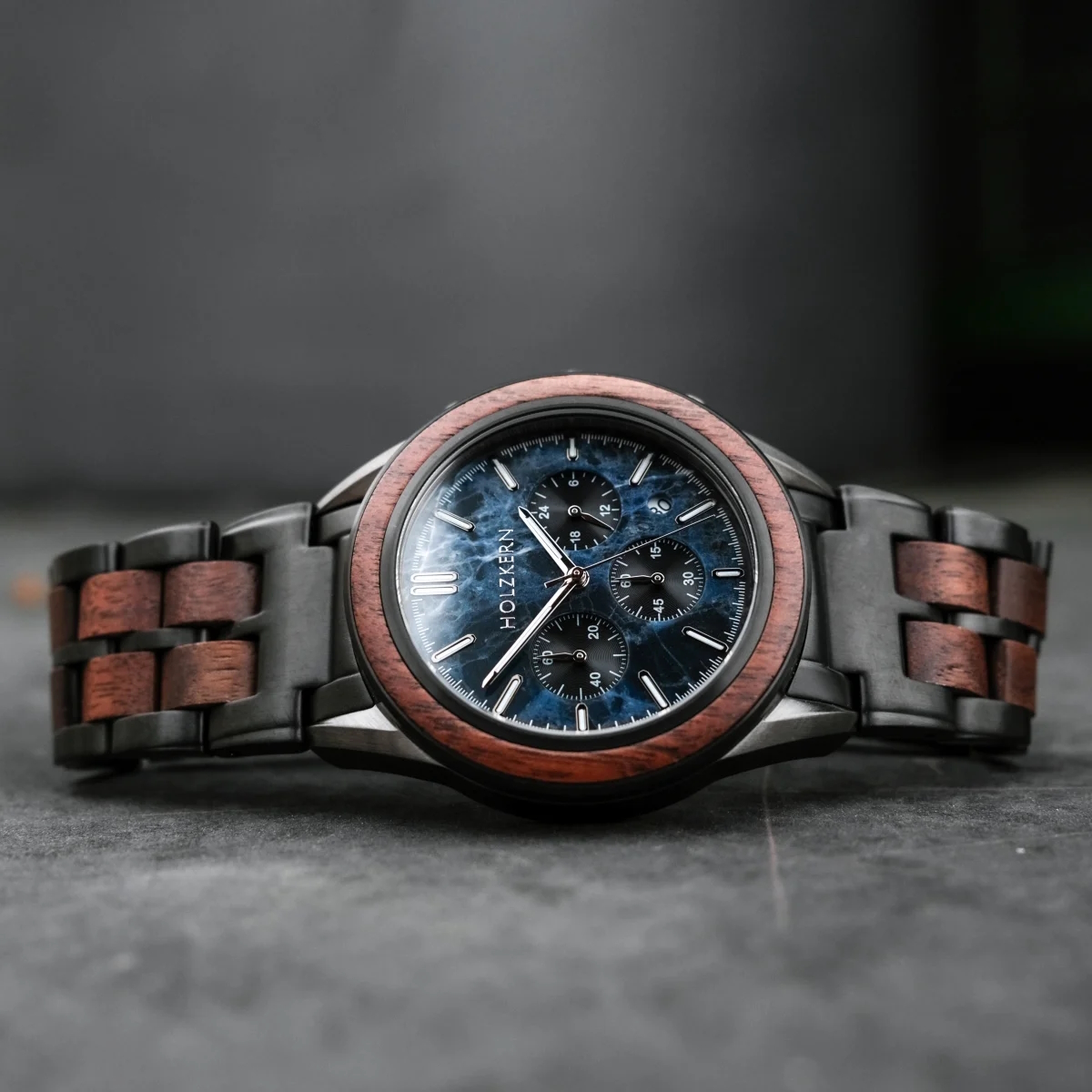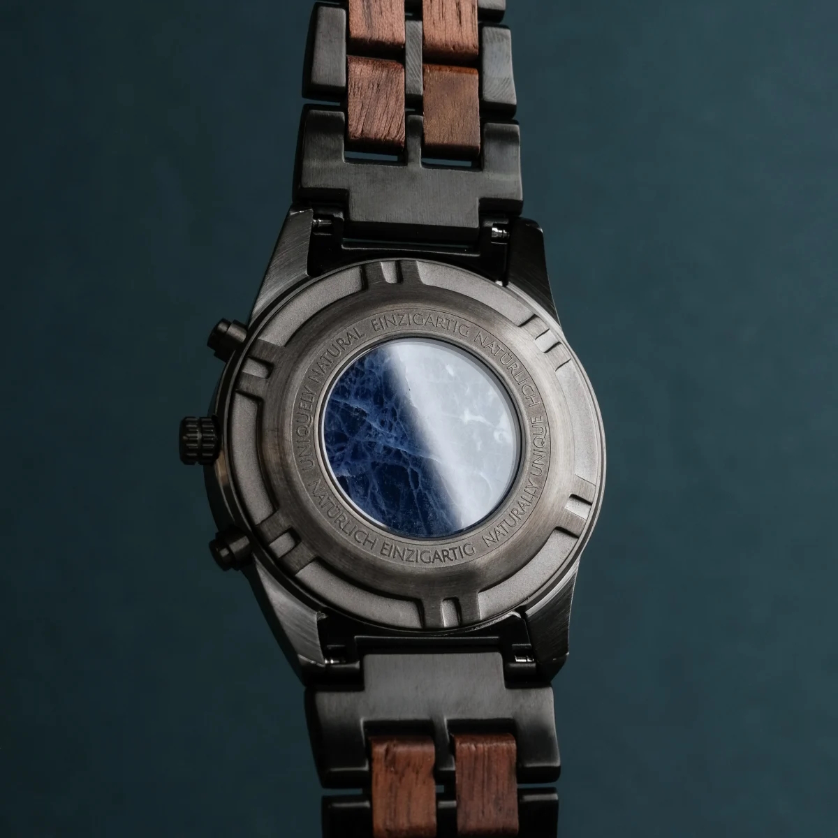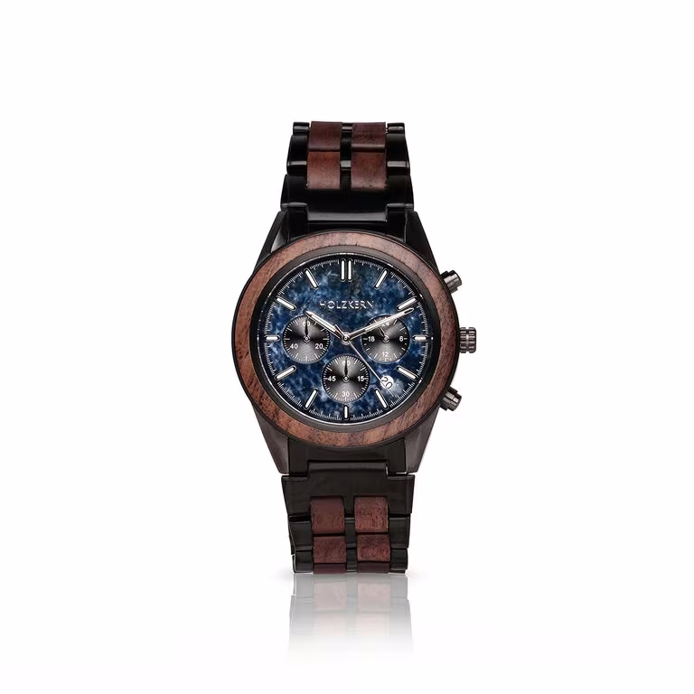 - Gehäuse: Durchmesser 43mm, gefertigt aus Walnussholz und Edelstahl in Dunkelgrau und Schwarz