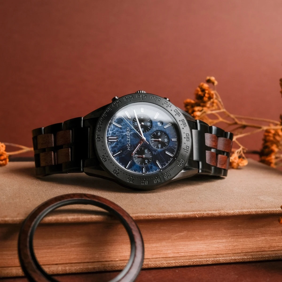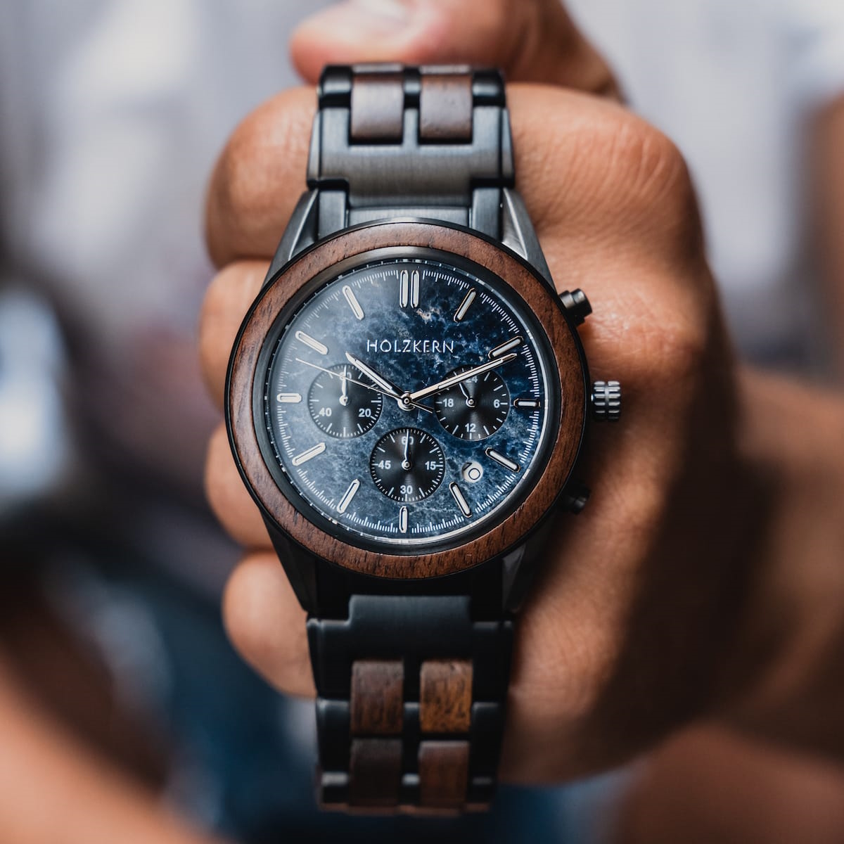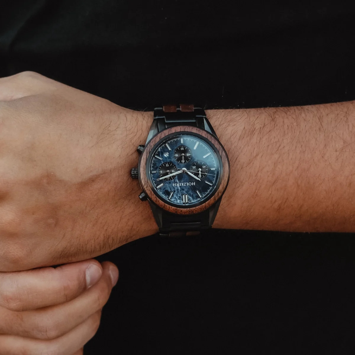 - Gehäuse: Durchmesser 43mm, gefertigt aus Walnussholz und Edelstahl in Dunkelgrau und Schwarz