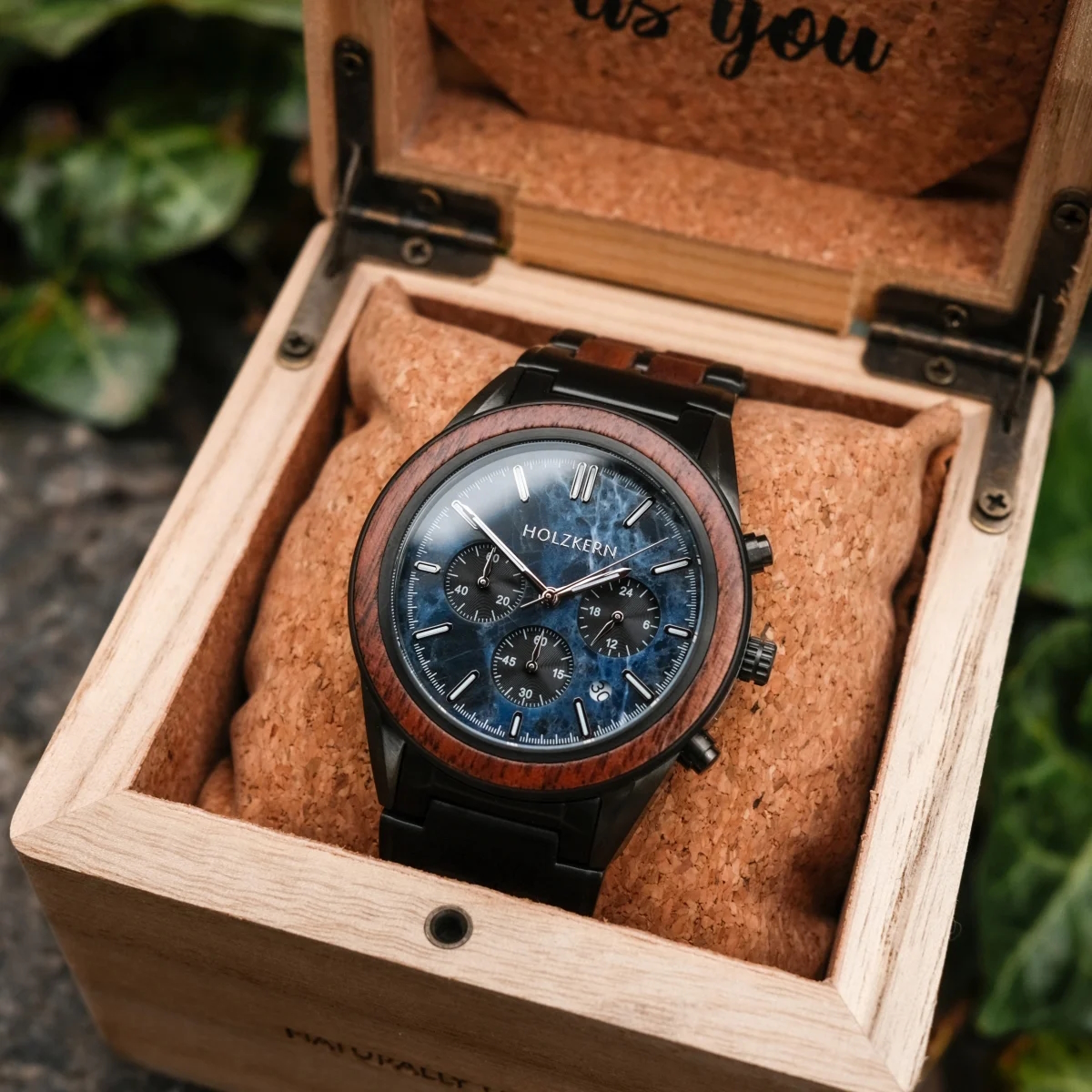 Edelstahl für Beständigkeit, Holz für Individualität — einzigartig vereint für Menschen, die beides wollen! Während Edelstahl deiner Uhr Robustheit und Widerstandskraft schenkt, bringt das Holz lebendige Strukturen in das Design. Erlebe ein modernes Accessoire mit tiefen Wurzeln in der Natur: Stark im Auftritt, leicht im Gefühl.
