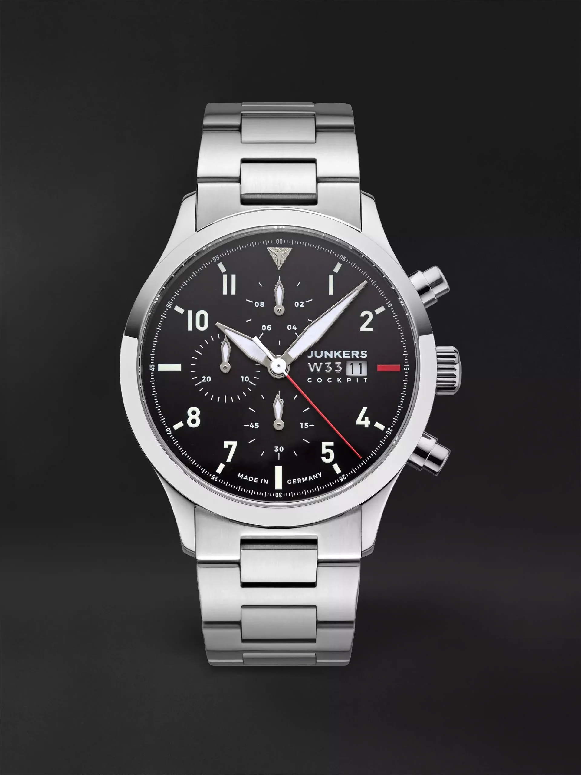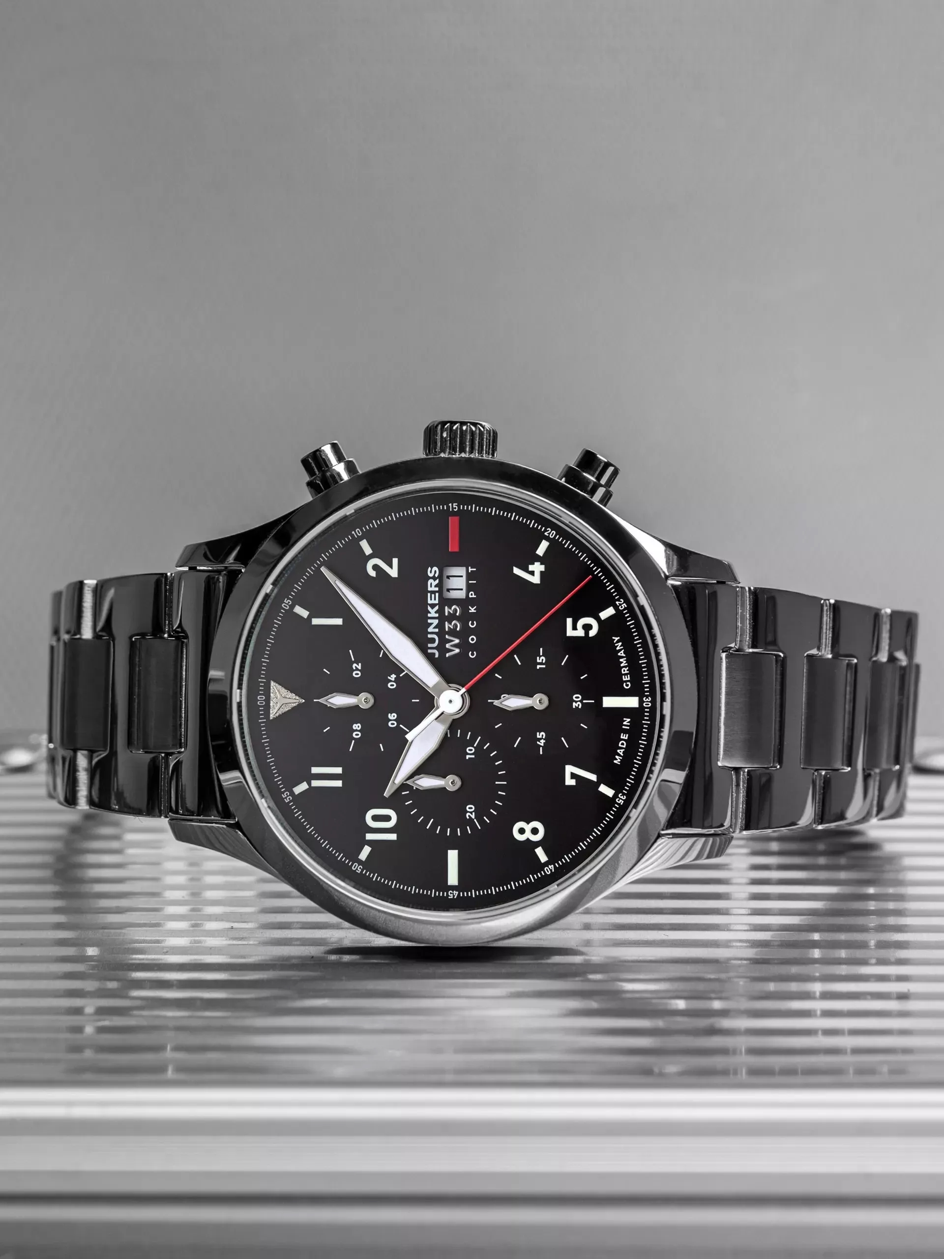 Die Serie „Junkers Cockpit“ zitiert mit Typografie und Zeigerform die klassischen Rundinstrumente der Flugzeuge jener Zeit. Alle Modelle sind Chronographen mit Leuchtmasse auf den Zeigern und bei den Modellen mit dunklem Zifferblatt zusätzlich auf den Indizes.
