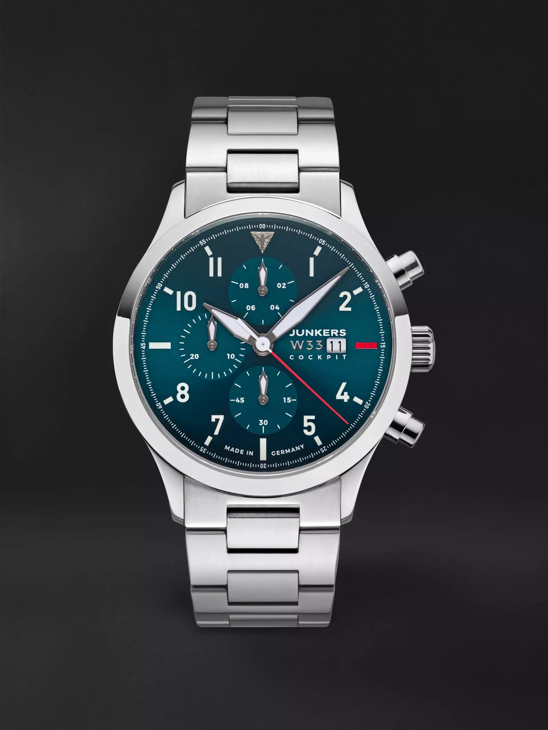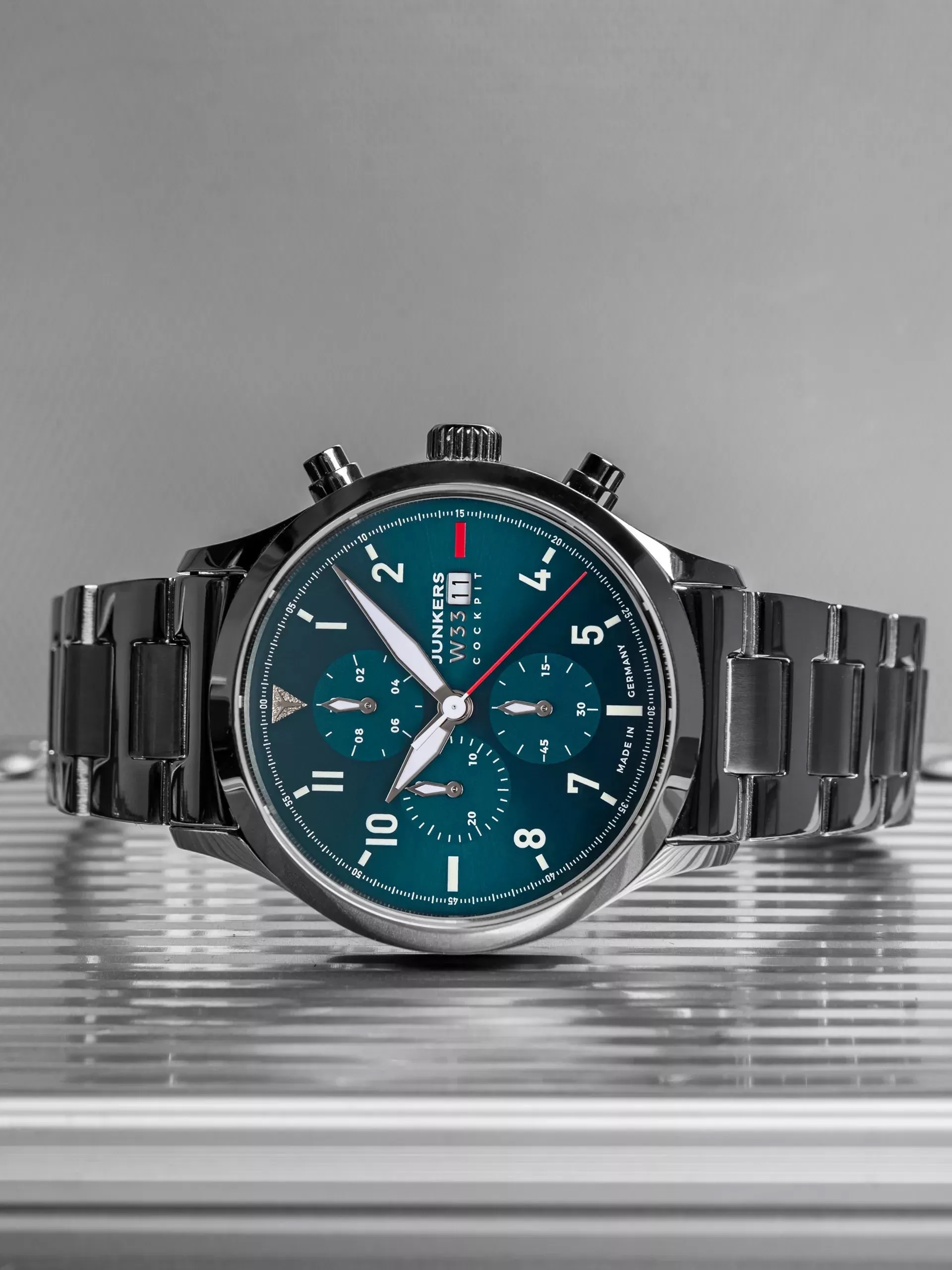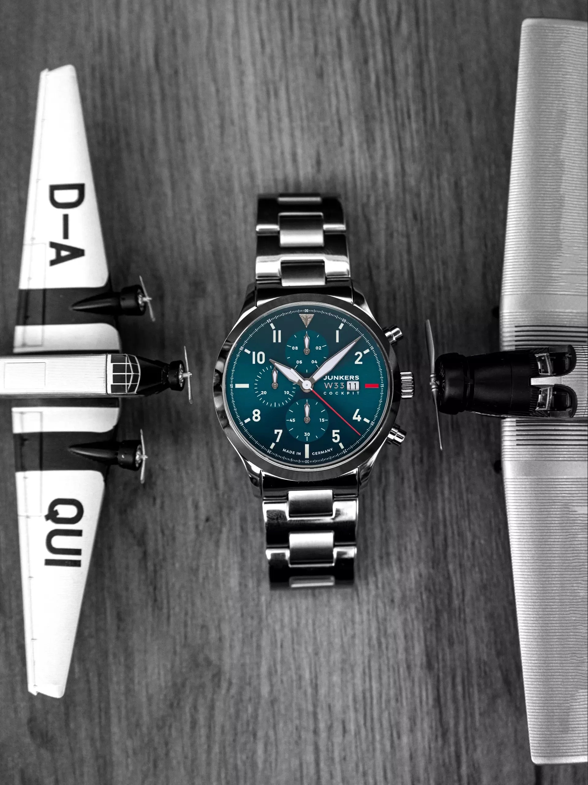 Die Serie „Junkers Cockpit“ zitiert mit Typografie und Zeigerform die klassischen Rundinstrumente der Flugzeuge jener Zeit. Alle Modelle sind Chronographen mit Leuchtmasse auf den Zeigern und bei den Modellen mit dunklem Zifferblatt zusätzlich auf den Indizes.