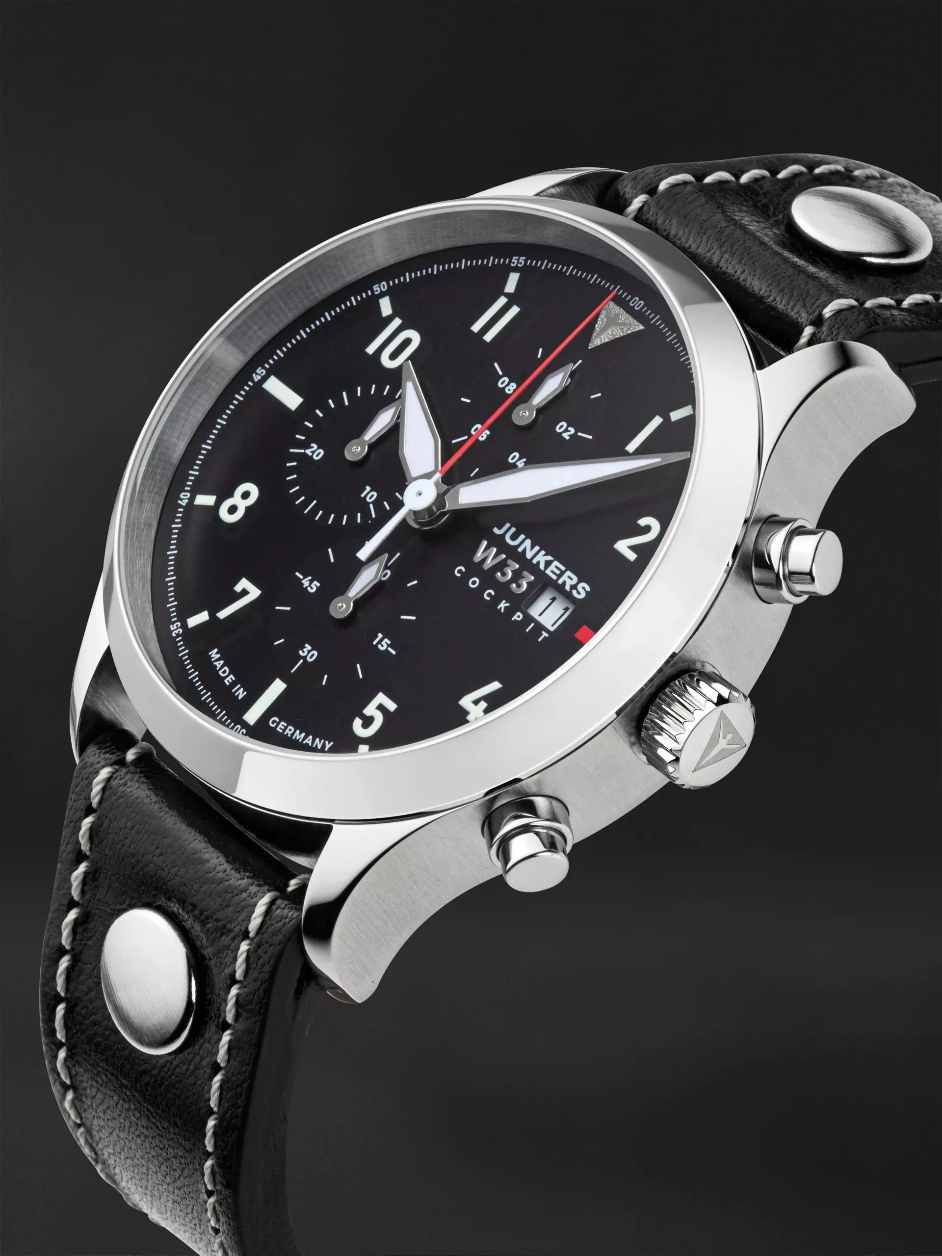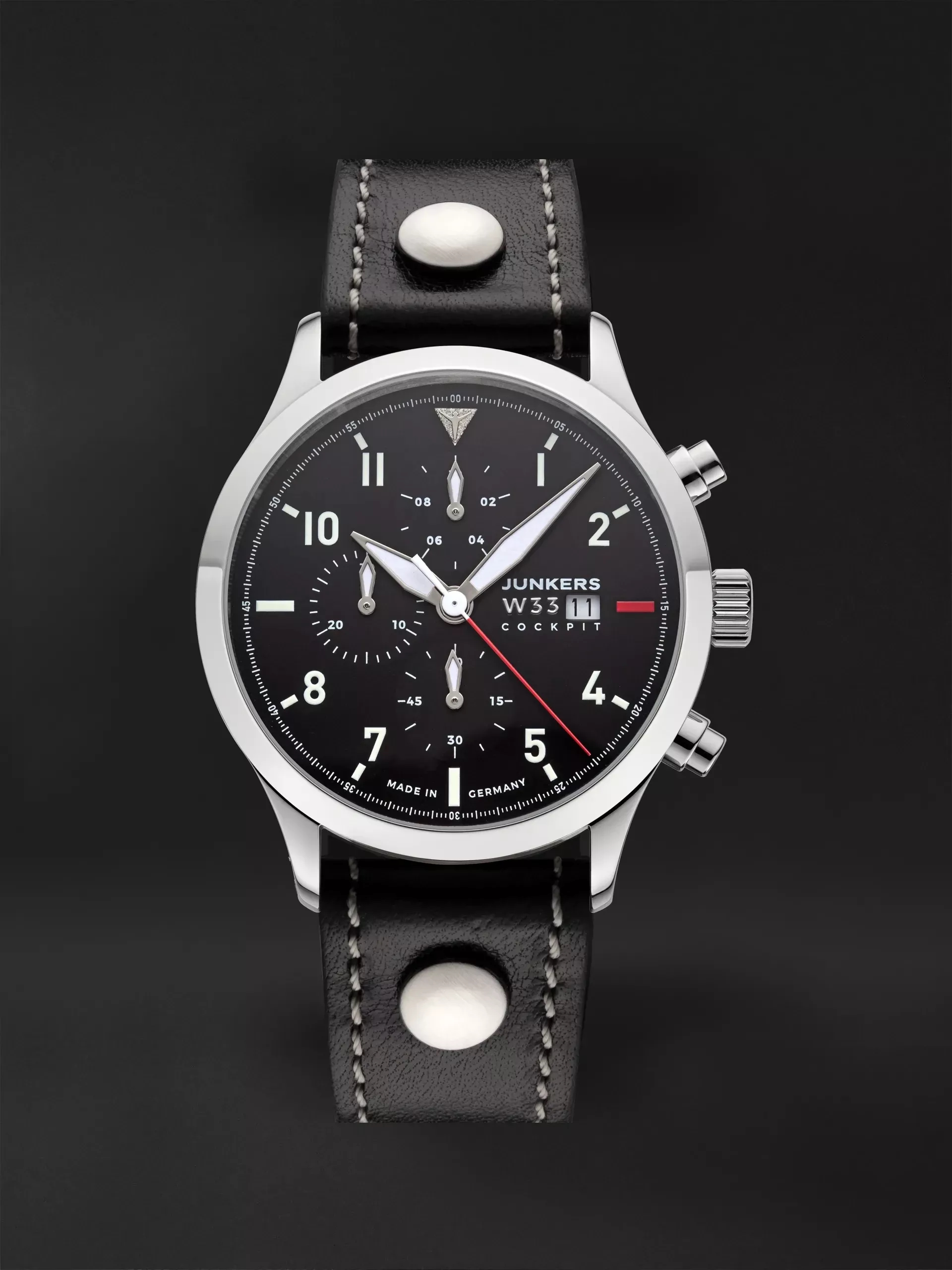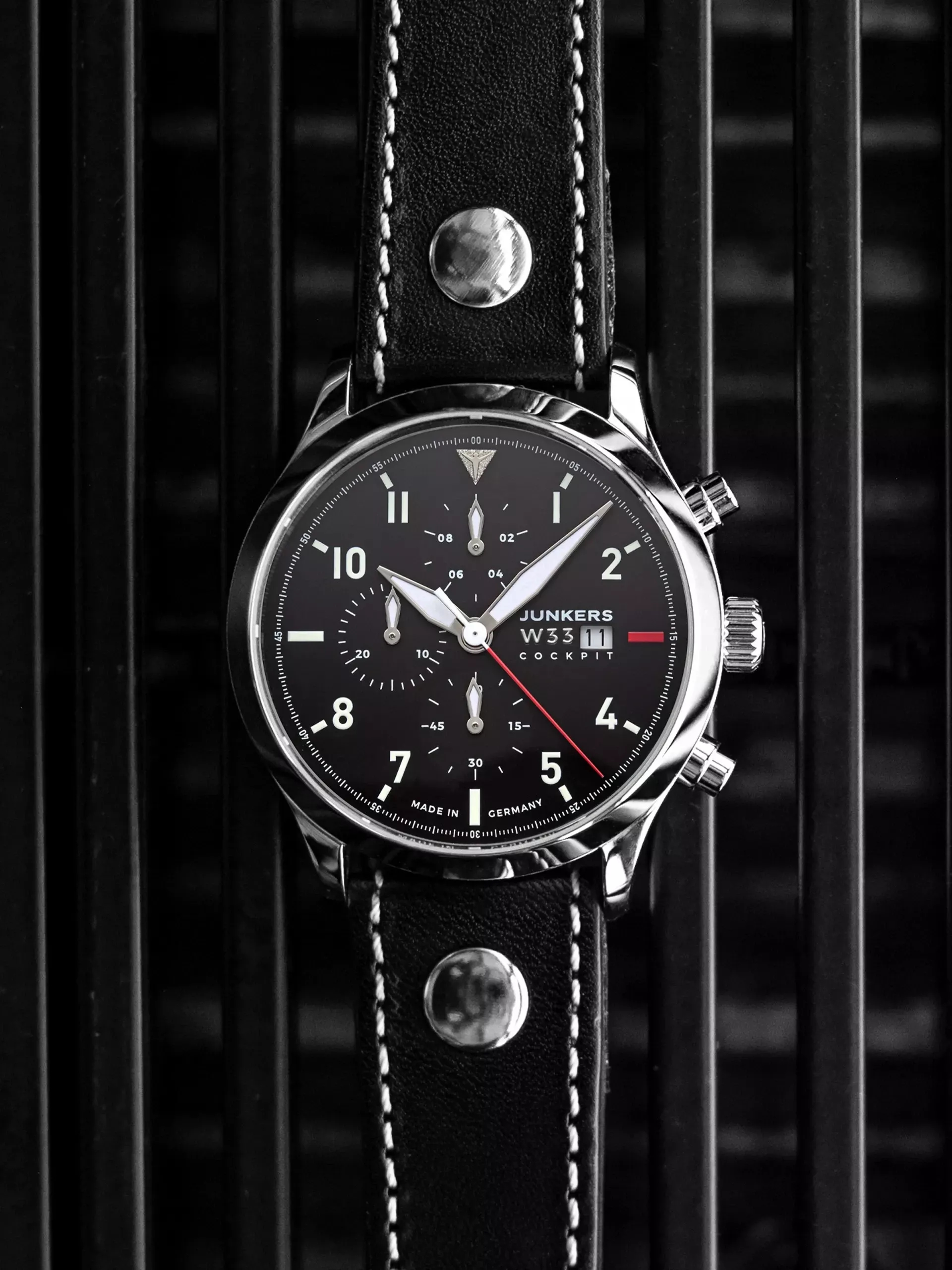 Die Serie „Junkers Cockpit“ zitiert mit Typografie und Zeigerform die klassischen Rundinstrumente der Flugzeuge jener Zeit. Alle Modelle sind Chronographen mit Leuchtmasse auf den Zeigern und bei den Modellen mit dunklem Zifferblatt zusätzlich auf den Indizes.