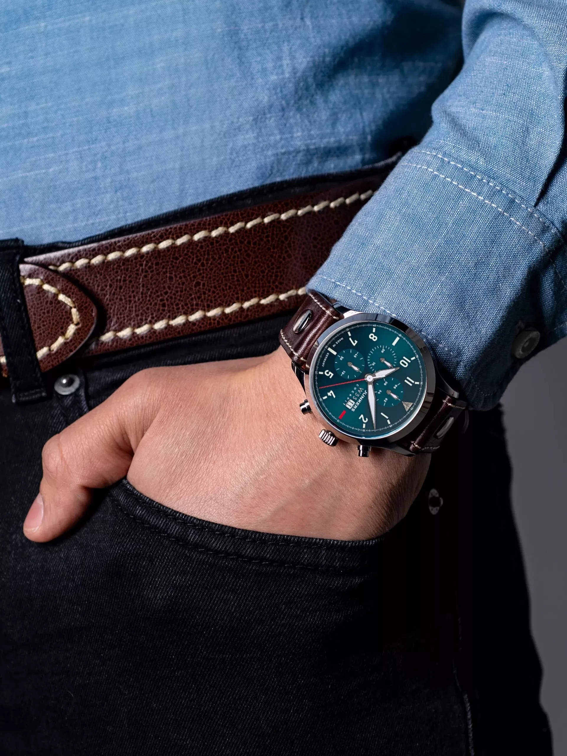 Besonderheiten | 3-Zeiger-Uhr , Chronograph , Datumsanzeige , Leuchtzeiger , Multifunktion , 12-Stunden Zifferblatt , Leuchtindizes , Saphirglas , Verschraubbare Krone , 60 Sek. Zähler |