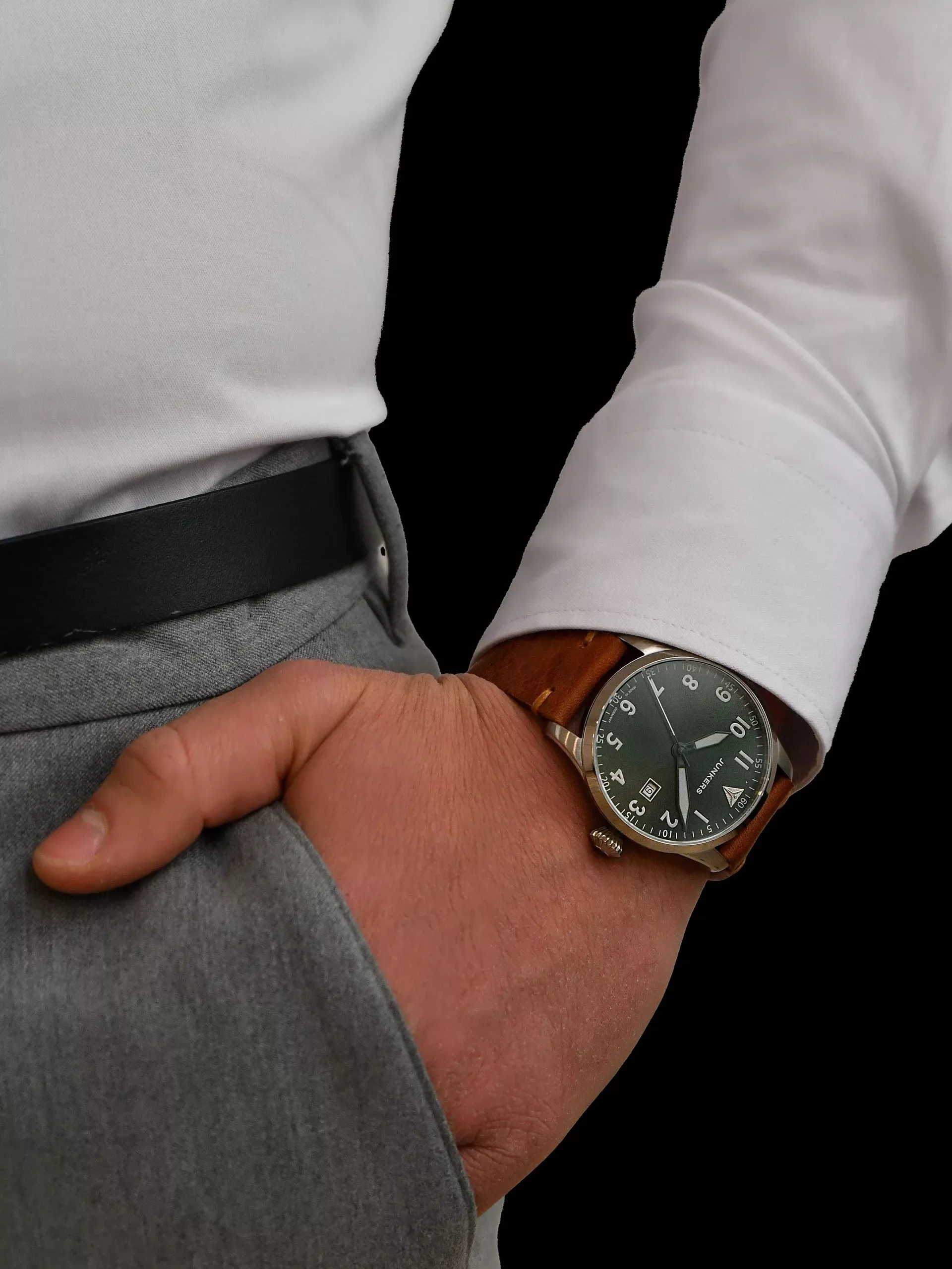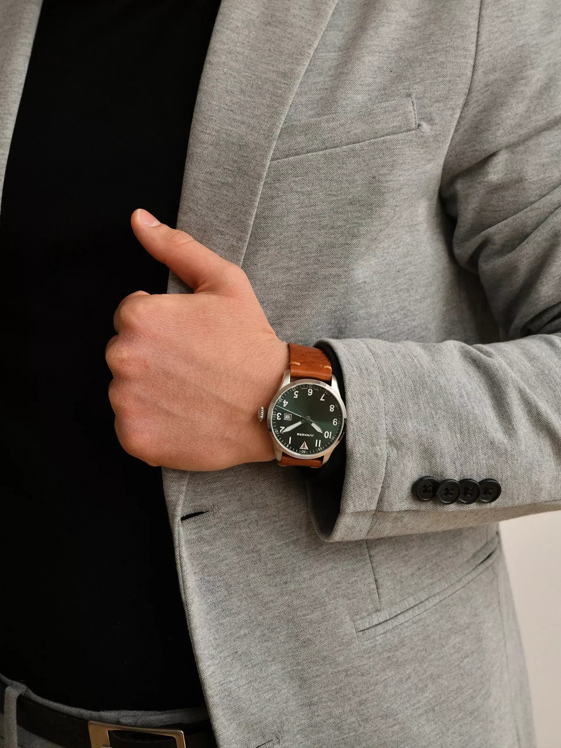 Schweizer ETA Uhrwerk Farbe Grün 42 mm Lederarmband Ref. 971.01.06