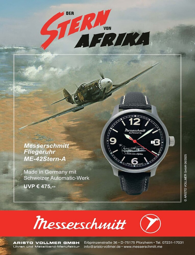 Die Automatikuhr Messerschmitt ME-42-A „Stern von Afrika“ in edel satiniertem Edelstahlgehäuse erinnert an den am 30.September.1942 wegen eines technischen Defektes über der ägyptischen Wüste abgestürzten Jagdflieger Hans-Joachim Marseille.
