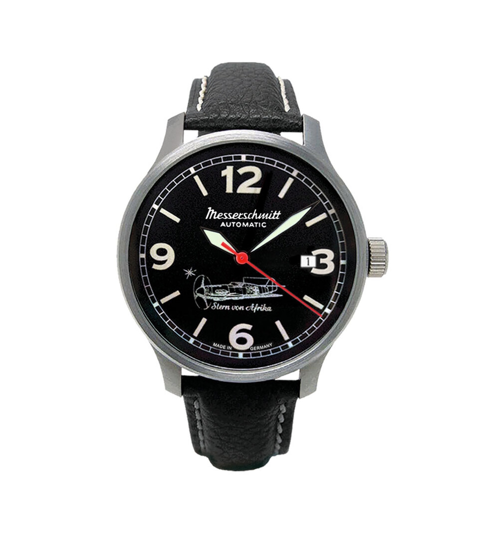 Auf dem Ziffernblatt ist die Seitenansicht einer Messerschmitt Bf 109F-4/Trop zu sehen. Die ME 109 gilt heute als eines der Meisterwerke des Flugzeug-Konstrukteurs Willy Messerschmitt. Ein hochwertiges Echtlederarmband garantiert den angenehmen und sicheren Tragekomfort. Diese Automatikuhr ist die Ergänzung zur Quartzuhr „Stern von Afrika“ für Liebhaber mechanischer Uhren.