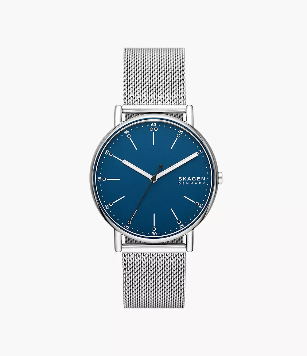 Diese Uhr Signatur mit 40-mm-Gehäuse hat ein 3-Zeiger-Werk und ein mattes, blaues Zifferblatt. Dazu gehört ein silberfarbenes Milanaiseband aus Edelstahl. Das Band ist auswechselbar.
