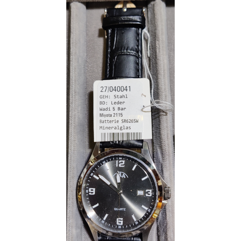 | Besonderheiten | 3-Zeiger-Uhr , Datumsanzeige , Leuchtzeiger , Mineralglas , Spritzwasserfest |